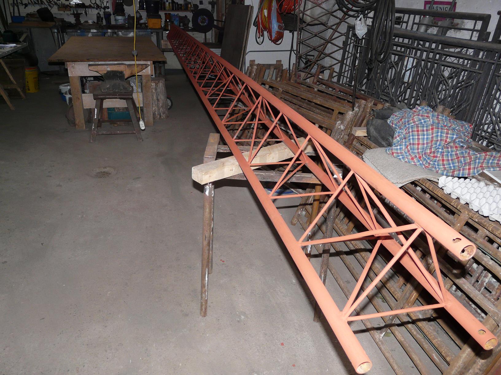 Rurka cal i ćwierć (33mm średnicy), grubościenna. Widoczne co 30cm oczyszczone miejsca w których następnie przyspawywałem wygięte wcześniej pręty rozporowe. Pełnią one również rolę doskonałej drabinki. Z uwagi na planowaną wysokość masztu oraz brak konieczności wyjątkowej sztywności konstrukcji zrezygnowałem z prętów skośnych.
