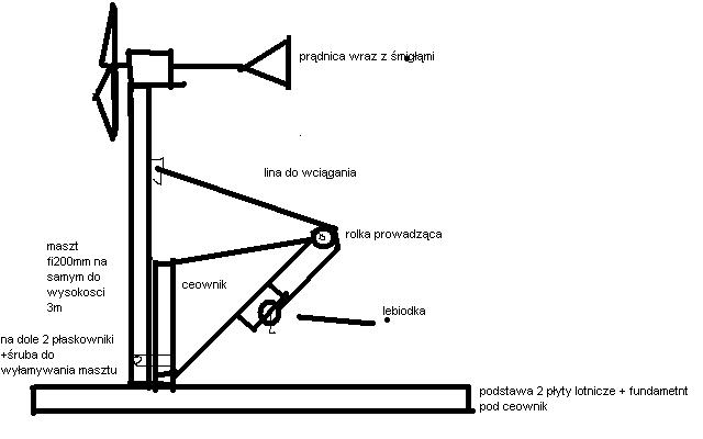 Porobię zdjęcia i wstawie na forum.Mechanizm jest oparty na lebiotce samochodowej (takiej na linke) udźwig do 1500kg.Najciężej ma ciągnąć do wysokości 5m a puźniej zmienia się kąt przełamania masztu i idzie coraz lżej.Pod koniec wciągania maszt prawie sam ustawia się do pionu.