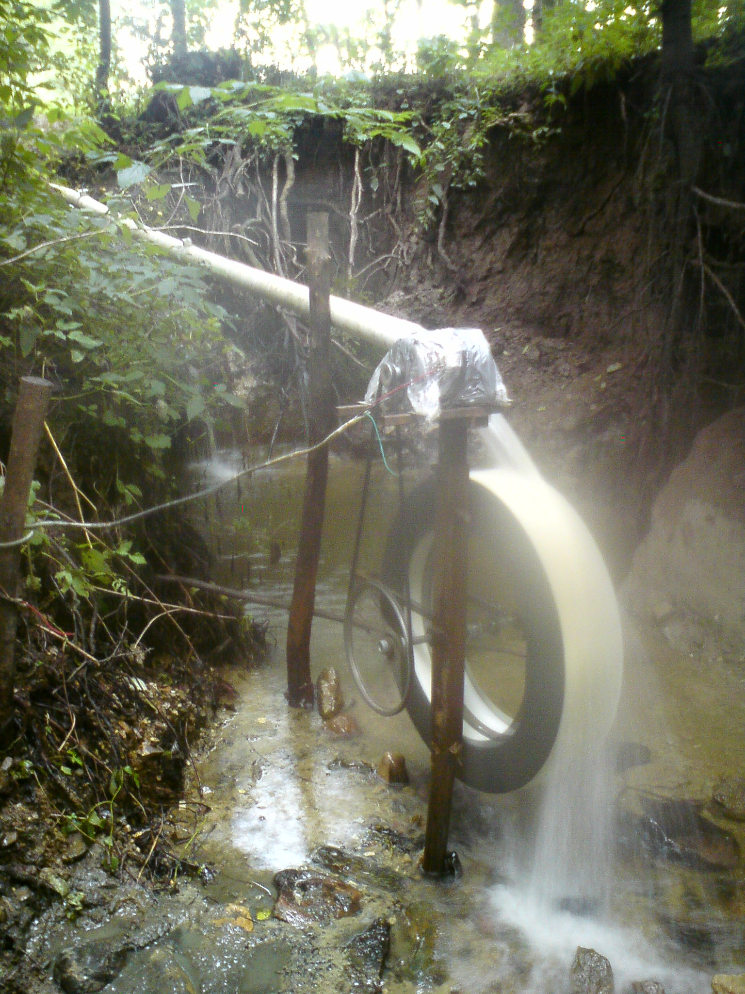 Po trzecie: 3. Mały przepływ stąd mała niesiona energia wody, chociaż są niezłe zachęcające obroty kręcącego się koła wodnego. Są one niestety tylko na LUZIE, gdzie pokonuje się jedynie mały opór na łożyska, no i część oporu powietrza i lepkość wody. Osobiście przykro mi że przy nieznacznym obciążaniu, to koło wodne mocno zwalnia, pokazując jaką rzeczywiście małą moc ta wykorzystywana struga wody niesie.