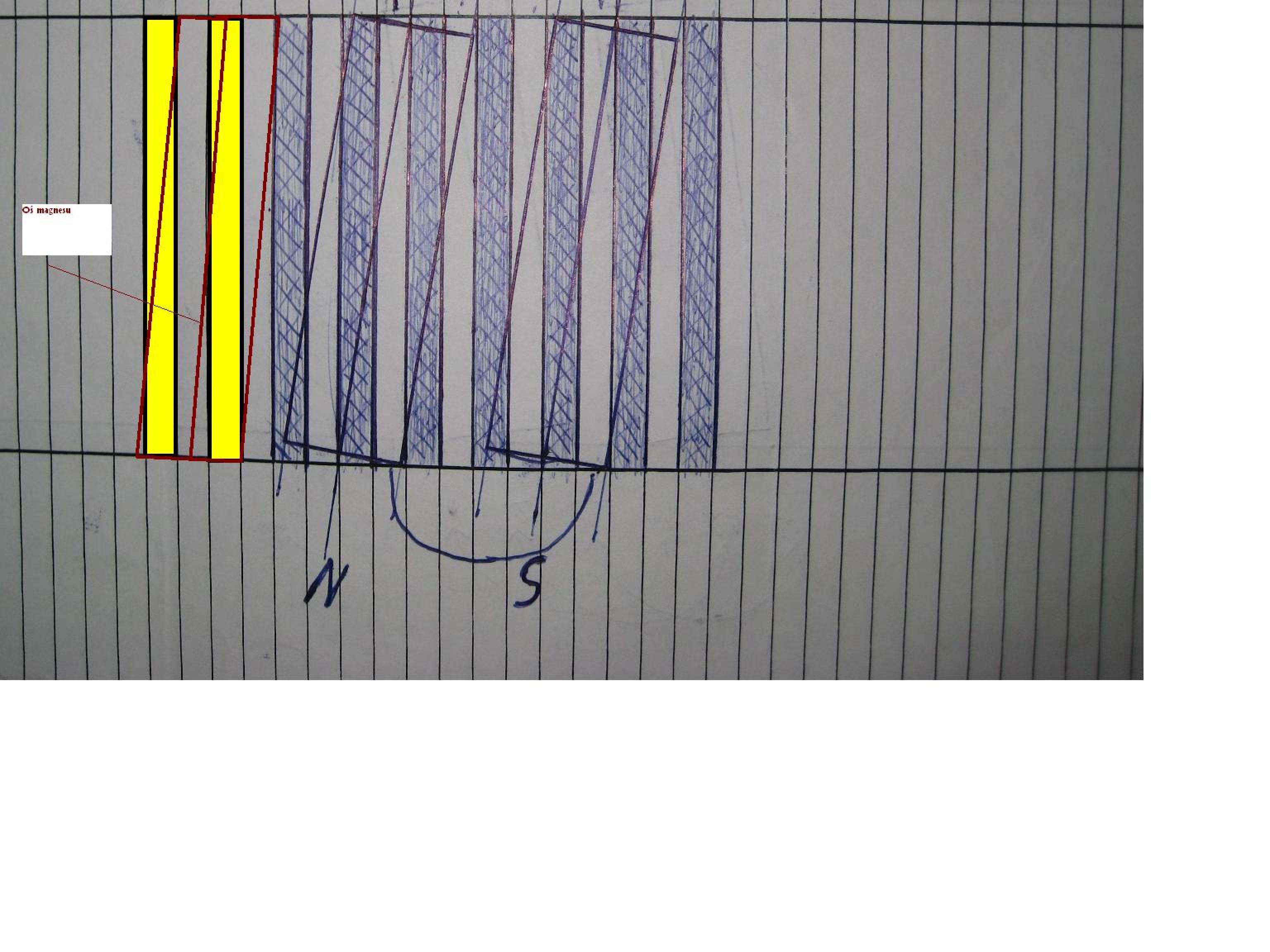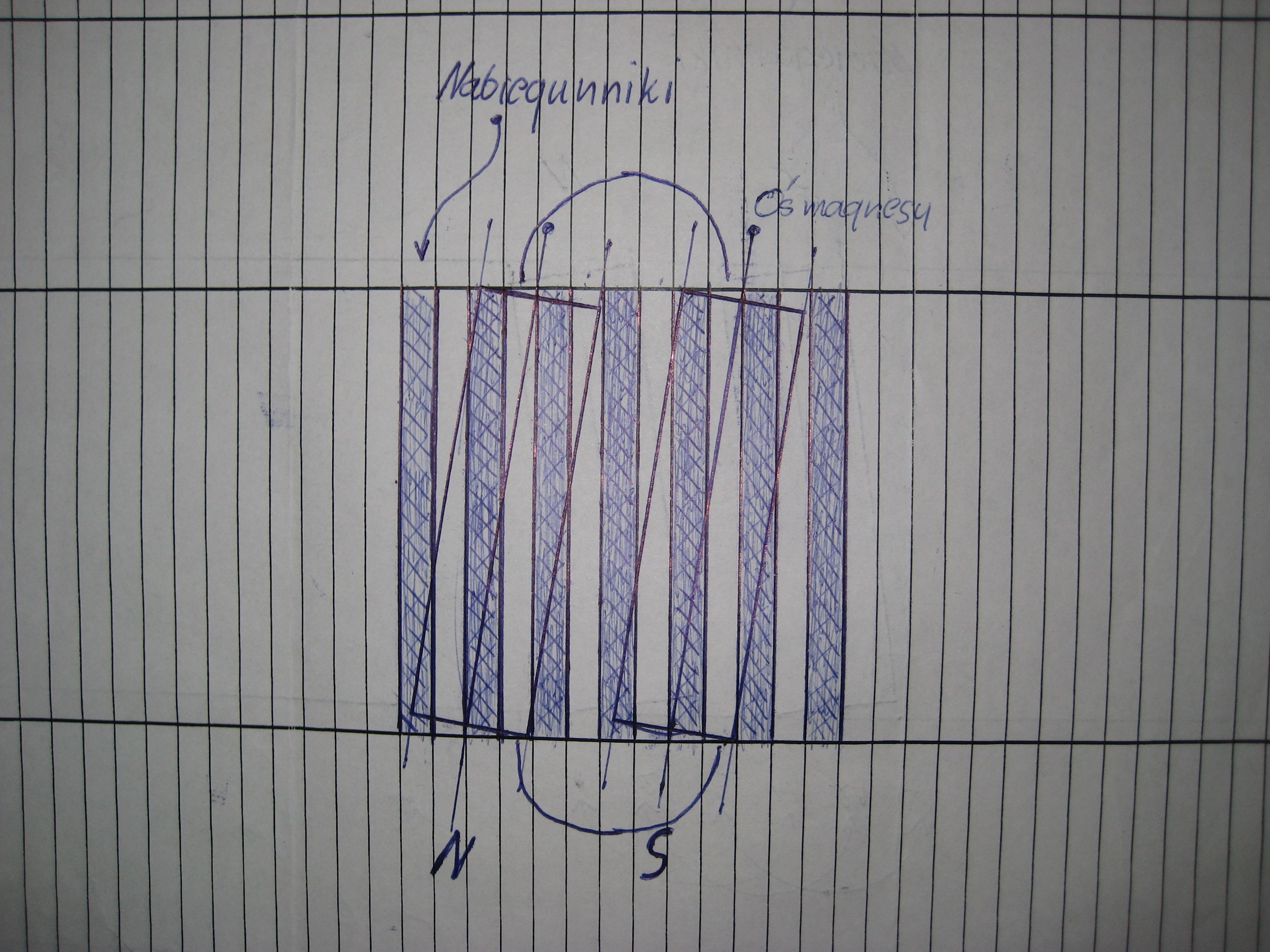 Juriii napisał(a):Witam koledzy. Dzisiaj w pracy cieżko szarpałem, i narysowałem sobie z nudów rozkład magnesów względem stojana. Zakładając że magnes przyciąga metal w swojej osi (jeśli porzyłożymy magnes powiedzmy do śrubokręta to śrubokręt ustawia sie po środku magnesu), to można założyć że przy takim ustawieniu magnesów jak narysowałem zaczepy będą jak najmniejsze? Magnes ma szerokość powiedzmy te 2,5 żłobka, jak na rysunku. Oś magnesu leży nad nabiegunnikiem i żłobkiem, podczas przesówania sie ubywa tyle samo nabiegunnika ile przybywa. Oczywiście w osi magnesu.