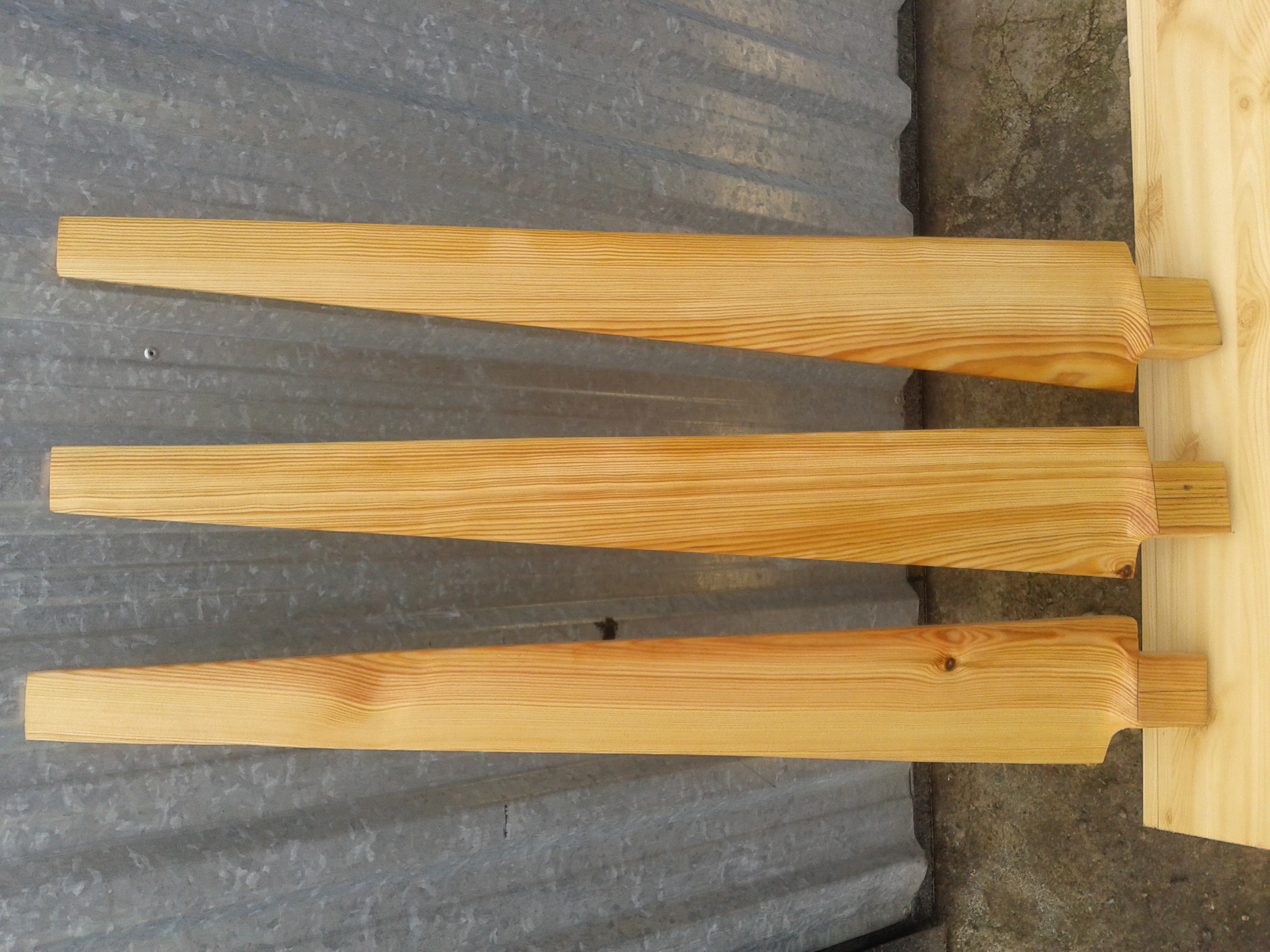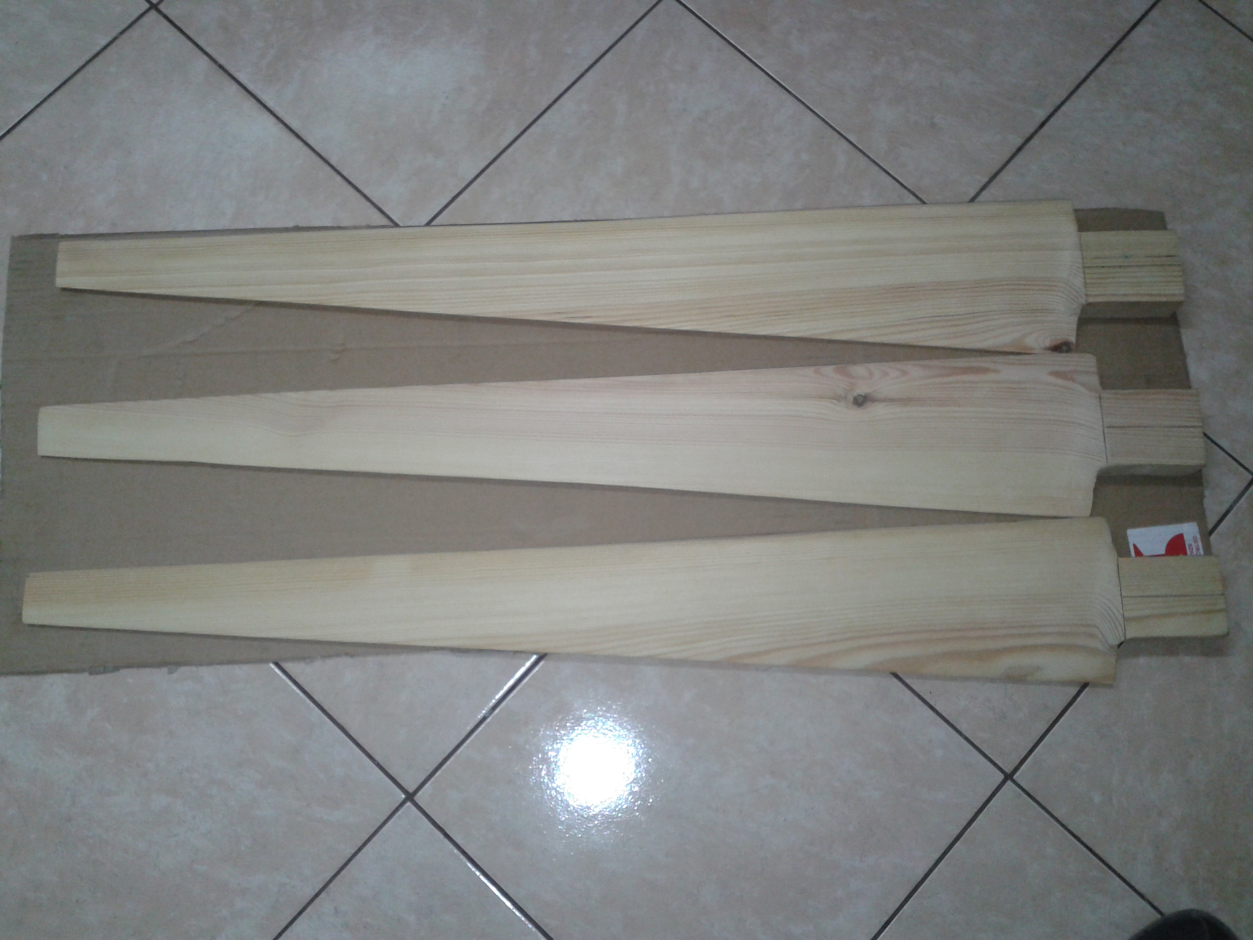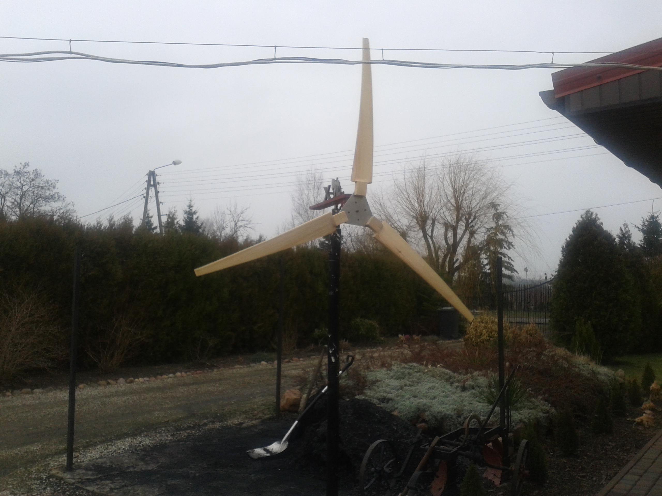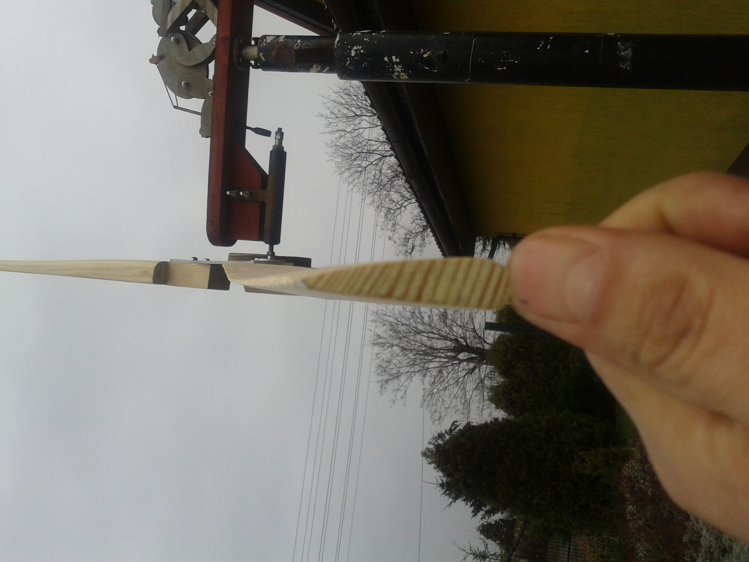 Łopatki są całkowicie homemade. Nie mam kopiarki choć myślę o jej zrobieniu i to intensywnie. Do wykonania łopatek użyłem tradycyjnie, struga, piłki do drewna, szlifierki kątowej, packi do szlifowania gładzi, suwmiarki. Dane podpatrzyłem z anglojęzycznej strony. W sumie to było kilka wymiarów: szerokość i grubość u nasady, szerokość i grubość końca, spadki na poszczególnych stacjach. Najpierw zrobiłem wzornik na papierze, aby wszystkie łopatki miały taki sam kształt. Deskę podzieliłem na sześć stacji. Od strony ostrza odrysowałem kształt łopatki po czym od strony zawietrznej odciąłem zbędną część drewna. Pierwszej stacji od nasady nie ruszałem, dopiero od połowy drugiej zaczynałem odcinać to co niepotrzebne. Mając już kształt, odrysowałem i wyszlifowałem właściwy profil łopat. Koniec łopatki od strony wietrznej ma spadek 2mm, na drugiej stacji (od końca) 4mm, na trzeciej 6mm, na czwartej 12mm. U nasady 37mm. Ostrze ma grubość 3mm. Stronę wietrzną szlifowałem "na płasko", natomiast zawietrzną "na półokrągło" aby uzyskać właściwy kształt. W zasadzie jak wyszlifowałem stronę wietrzną, to wyszlifowanie zawietrznej było najprostsze, ale uwidoczniło profil łopatek. Szlifując, na poszczególnych stacjach mierzyłem grubość i jakoś to wyszło. Ważyłem je wagą kuchenną z dokładnością do 1g. Dwie łopatki wyszły identyczne, różnica była 2g, a trzecia nieco lżejsza, dlatego, że ta jedna nie ma żadnego sęka drewno nie ma tyle żywicy i trzeba ją dociążyć o parę gramów. Na próbę przykręciłem je wkrętami do piasty i praktycznie bez dokładnego wyważania zrobiłem test na wysokości 2m od ziemi. Śmigła "wystartowały" i pięknie się kręciły, ale gdy nabrały obrotów, to wprawiały słupek w wibracje (brak wyważenia) i test zakończyłem. Śmigła zostały dopieszczone papierem ściernym 120 i są gładkie jak pupa niemowlęcia. Przyznaje, że są to moje trzecie śmigła ręcznie wystrugane w drewnie.