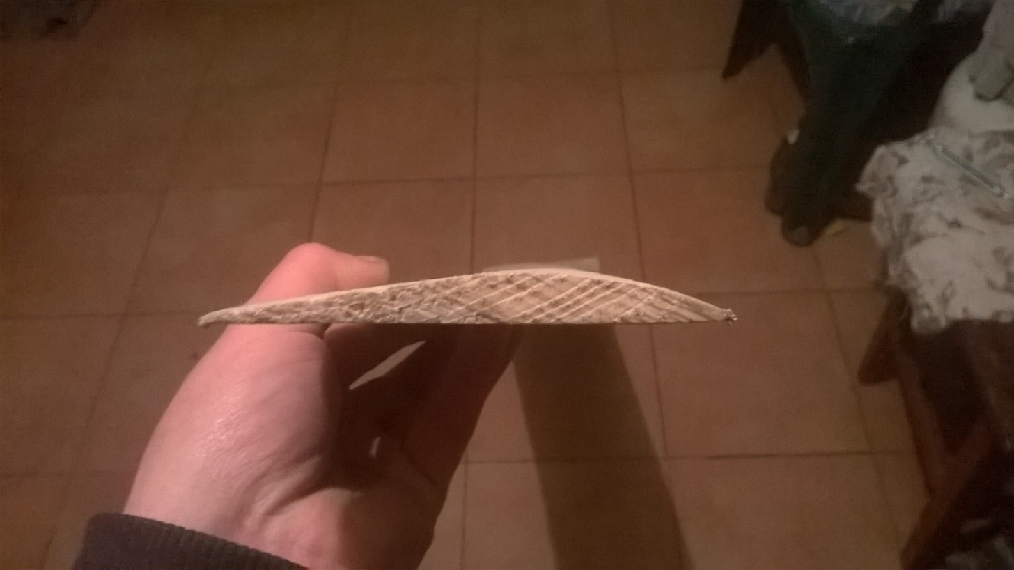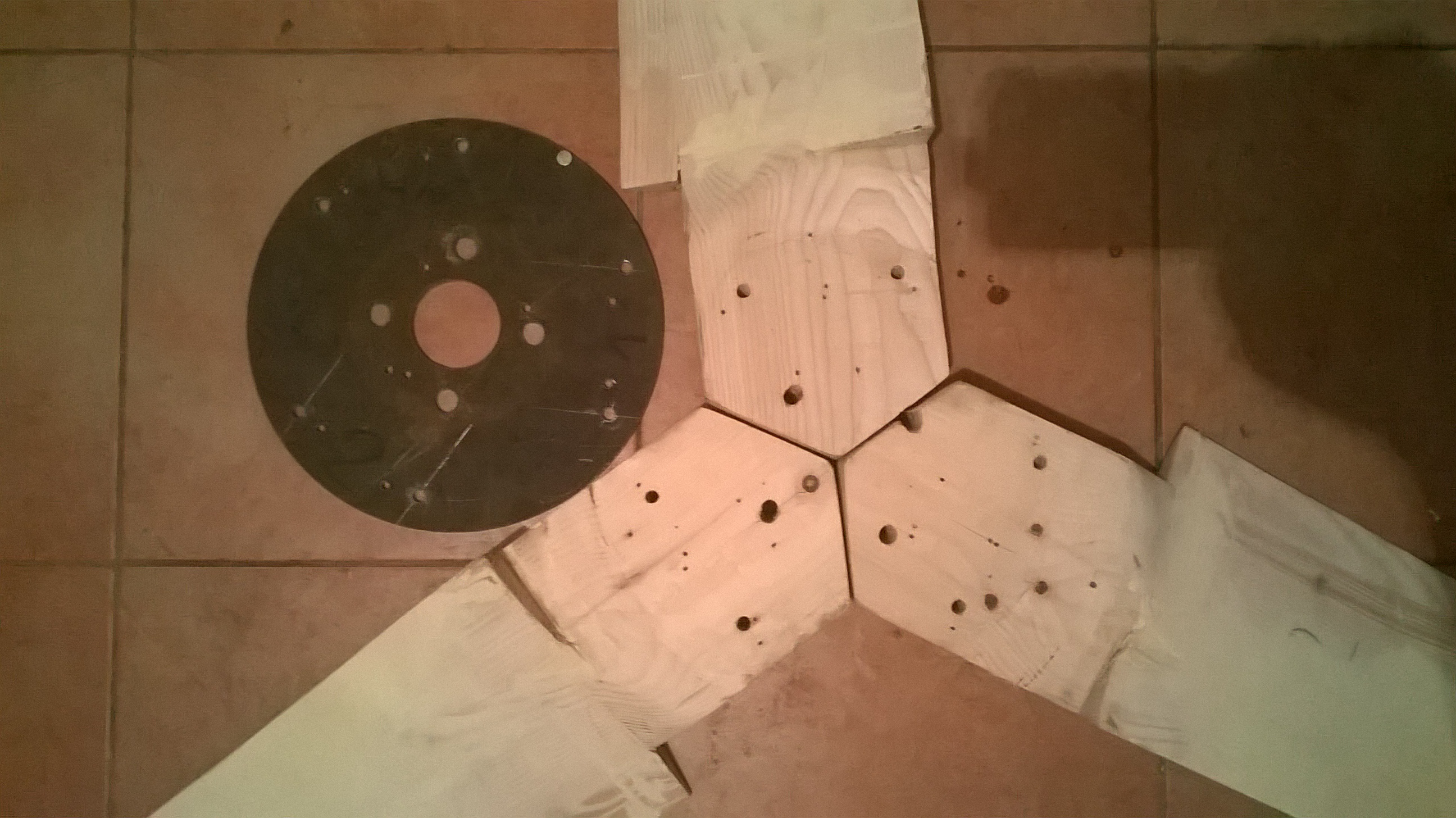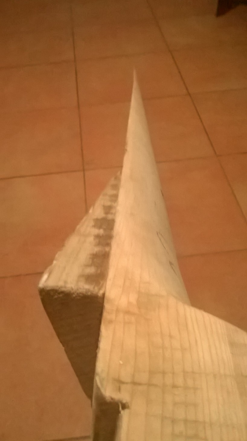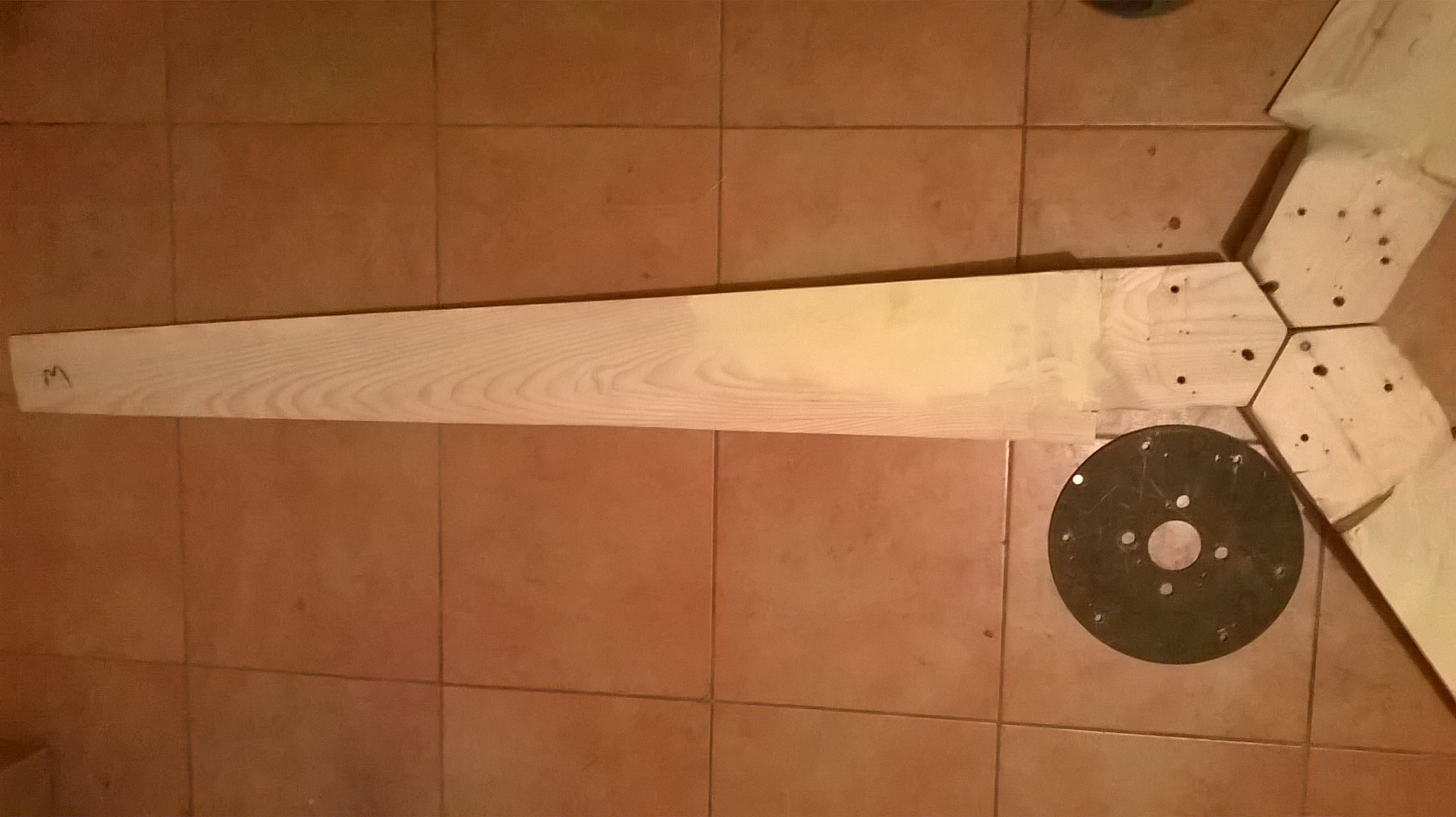 Śmigiełka 3m maja napędzać prądnice z silnika od wiatki która przypuszczalnie ma osiągać max ok 350W, czyli potrzeba do tego wiaterku ok 23km/h obroty śmigła osiągają wtedy ok 320obr/min (oczywiście obroty podane przez program i to prawdopodobnie bez obciążenia). Materiał to krokwie jodłowe o wym 150x15x6,5cm. Wykonane w oparciu o dane z programu wiatrak, postawiłem na szybkobieżność i wybrałem Z=8, obrys trapezowy w najszerszym miejscu 19cm końcówka 10cm.Wewnętrzna średnica części roboczej wynosi 40cm ,największy kąt u podstawy jaki udało mi się uzyskać przez doklejenie u podstawy to 26 stopni i tak w odległości 20-40 od osi obrotu są zmiany w kątach względem tych z programu ponieważ materiał nie pozwalał na uzyskanie większych kątów dlatego wyszło jak wyszło, kąt końcówki zrobiłem ok 2 stopni (celowo zmniejszyłem żeby później zmieniać kąt przy mocowaniu z zachowaniem parametrów z programu).