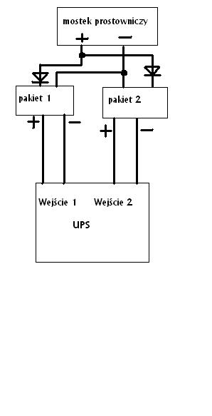Tego bym nie robił,podłączyłbym te pakiety równolegle pod wejście UPSa,to główne. Dodatkowa dioda to dodatkowa strata.No i nie wiadomo jak będzie się zachowywał UPS.