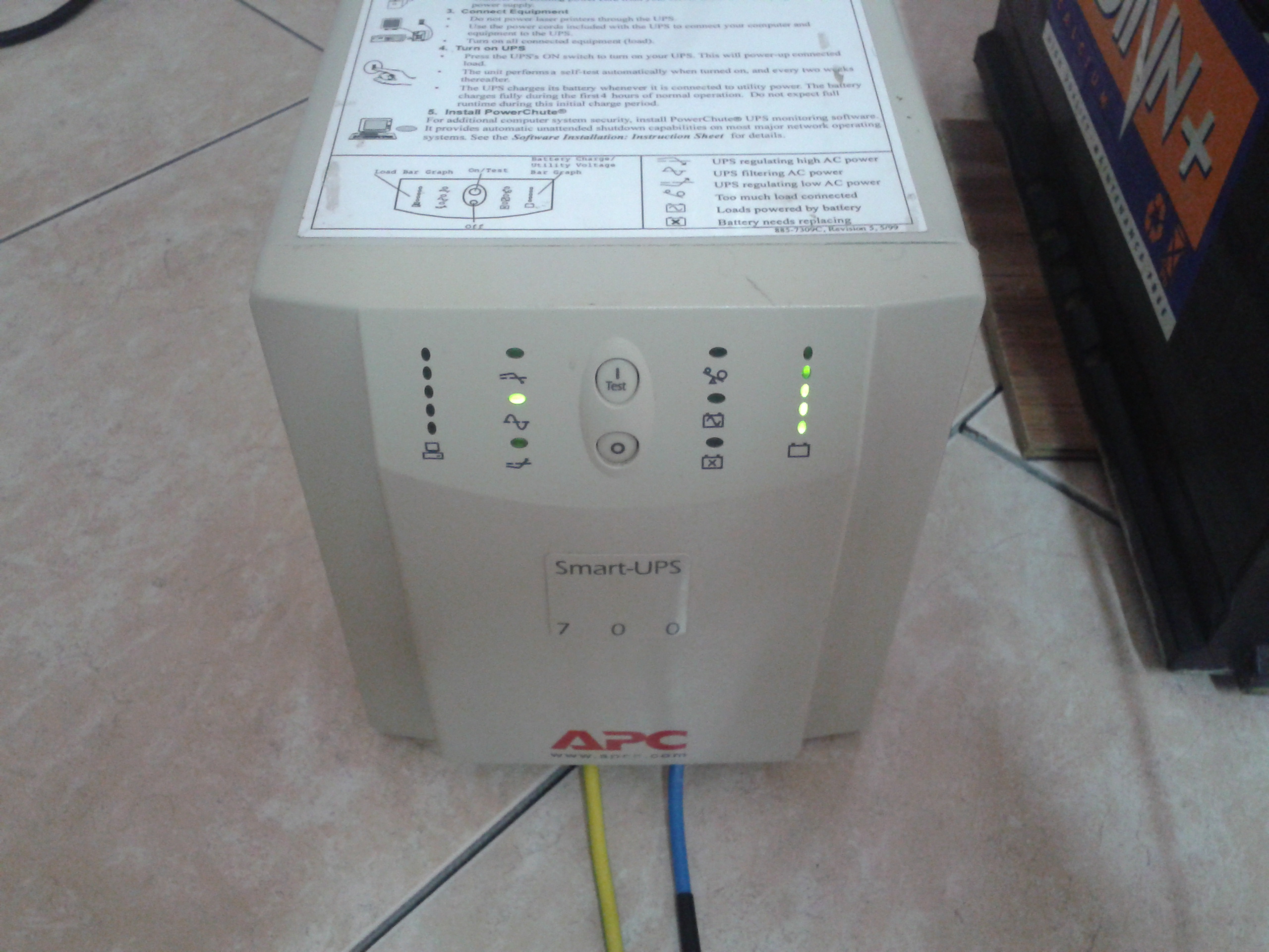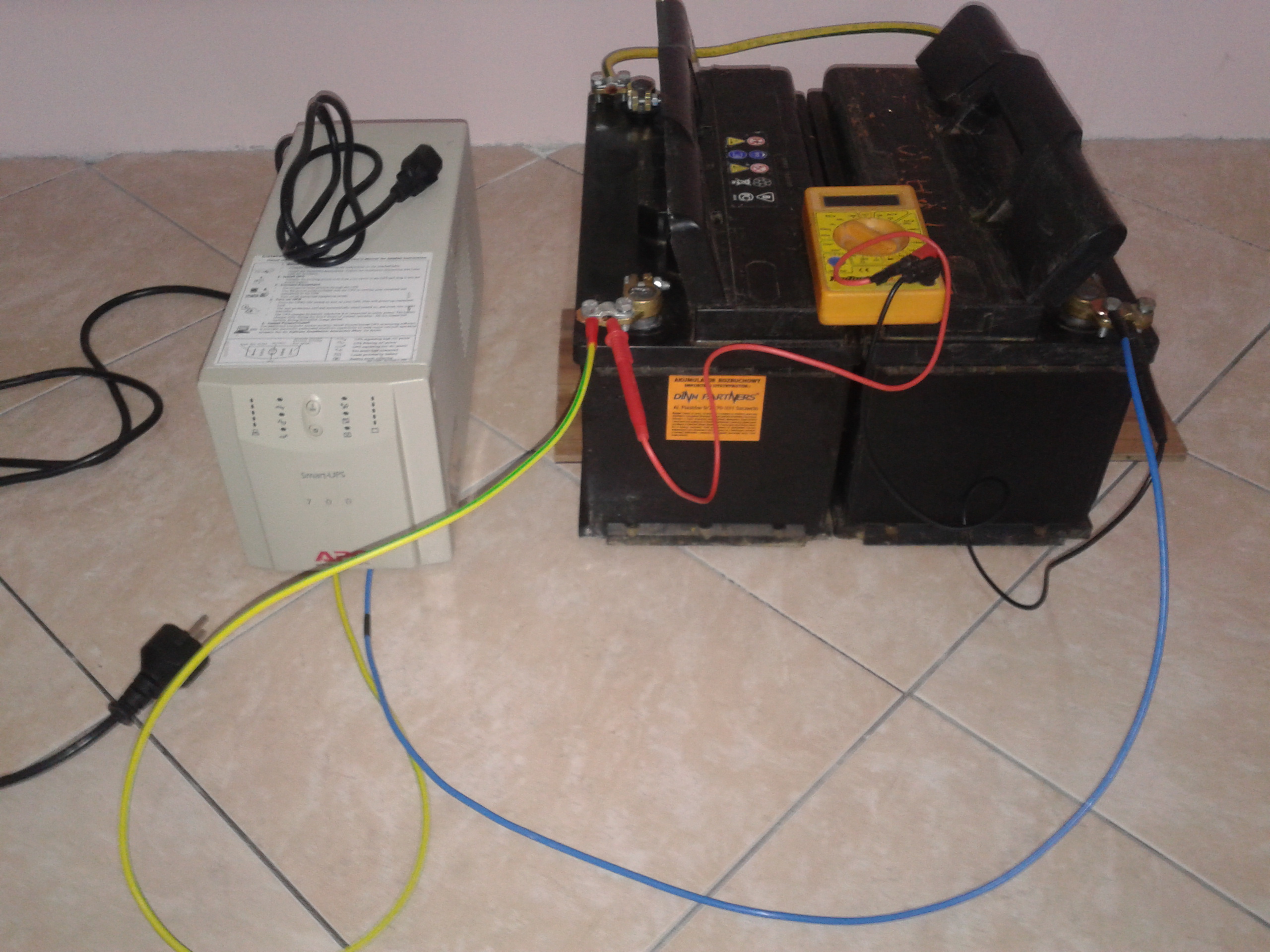 . Przed uruchomieniem dokładnie zapoznałem się z instrukcją obsługi tego sprzętu, którą otrzymałem od sprzedającego. Przygotowałem dwa akumulatory 12V 100Ah, które połączyłem szeregowo. Akumulatory wskazywały 24,5V. Następnie podłączyłem UPSa do baterii. Tak jak było napisane w instrukcji, podczas podłączenia lekko zaiskrzyło, co jest normalne. Podłączyłem do sieci, po tej czynności na wskaźnikach przedniego panelu nic się nie działo. Po naciśnięciu włącznika I/Test, zapaliły się kontrolki z prawej strony, które migały, na chwile zapaliła się kontrolka zasilania z baterii, po czym UPS przeszedł w stan ładowania baterii. Auto test przeszedł pomyślnie i UPS