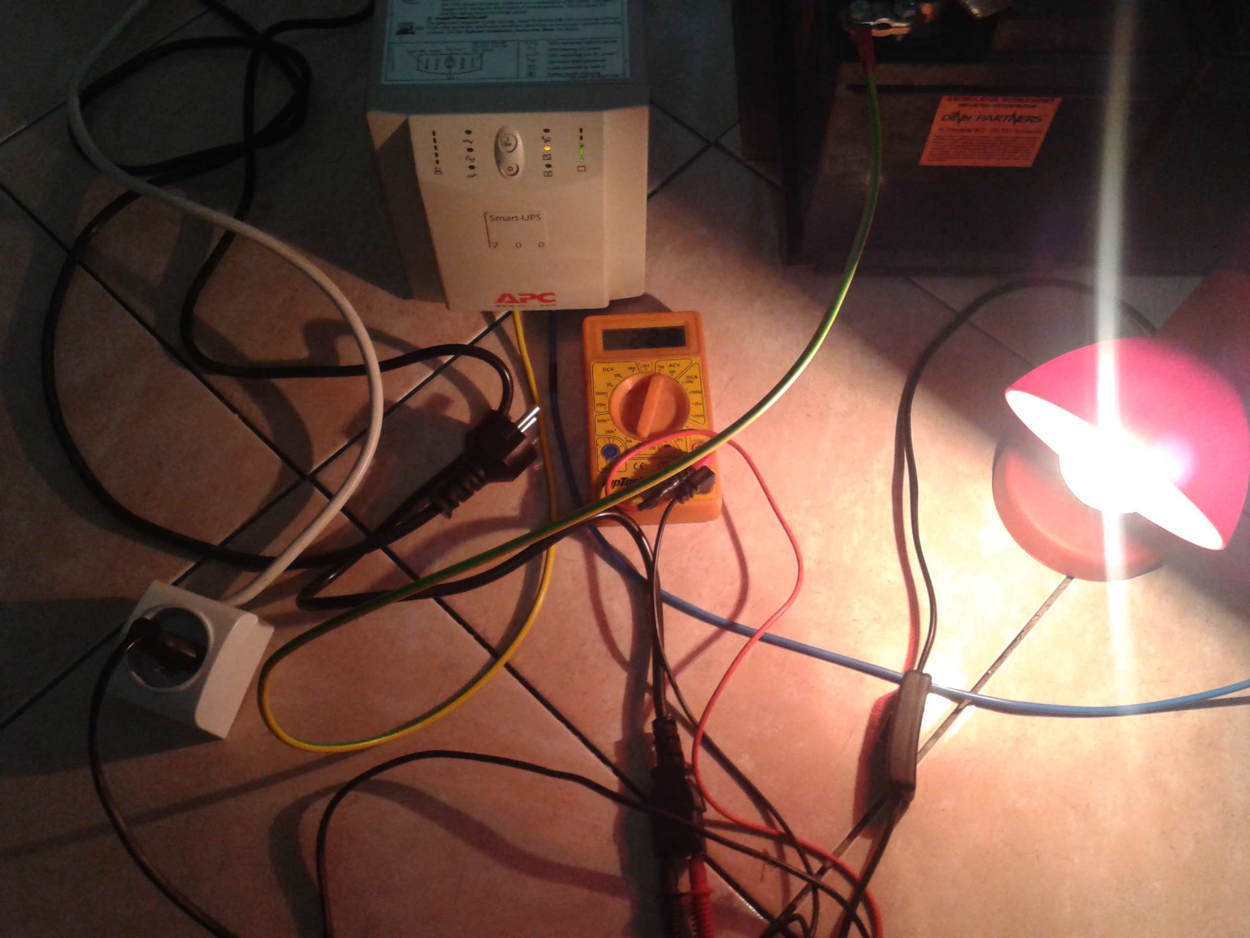 skonfigurował się sam. Miernik na bateriach wskazywał stabilne 25,5V. Na wyjściu napięcie zasilania wskazywało 228-233V. Po tym odłączyłem zasilanie z sieci, UPS automatycznie przełączył się na zasilanie z baterii, a napięcie na wyjściu zasilania 228-230V takie samo jak na zasilaniu z sieci. Podłączyłem lampkę z żarówką 40W. Na wskaźnikach po lewej stronie nie zapaliła się nawet pierwsza kontrolka wskazująca stan obciążenia (pierwsza od dołu wskazuje 17%). Przeprowadziłem też "zimny start". Urządzenie włączyło się bez zarzutu, napięcie zasilania z baterii było takie samo jak wcześniej. Z ciekawości podłączyłem wiertarkę 650W i ku mojemu zdziwieniu kontrolki z lewej strony wskazały stan obciążenia UPSa na poziomie 67% (brawo). Czyli zapotrzebowanie mojej kotłowni na prąd, będzie małym problemem dla tego UPSa, a to oznacza także, że będzie pożytek z darmowej energii dla innych mało żernych urządzeń w domu. Koledzy, jestem bardzo zadowolony z zakupu tego sprzętu. Dodam kilka fotek z testu.