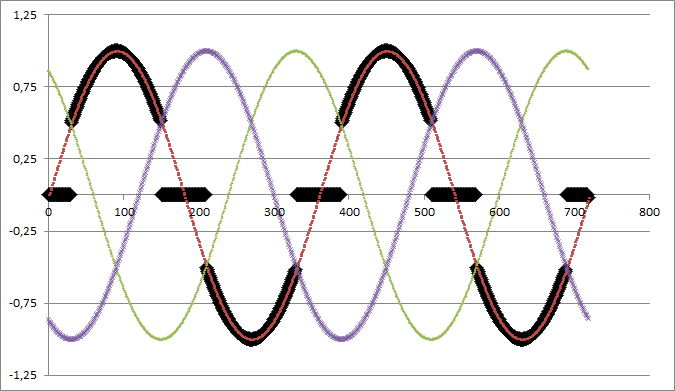 Czyli coraz bardziej udowadniamy teorię: dana dioda (jedna z sześciu) przewodzi przez 1/3 czasu. Dana faza jest obciążona przez 1/3 czasu (w "lewo") i 1/3 czasu ("w prawo") przy czym zbieramy z niej moc tylko jeżeli |U| > 0.5Umax (lub prawidłowo gdy |U| jest więsza niż napięcie na każdej innej fazie), przez pozostały czas faza jest nieużywana (czyli potencjalnie nie korzystamy z dostępnej energii).