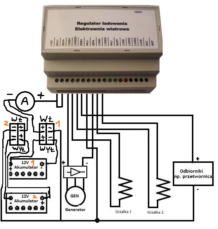 Zaraz... A ten regulator to do czego zrzuca oprócz tego co ma podłączone do wyjść. Teoretycznie proszę pamiętać, że ten drugi akumulator będzie ładowany tylko wtedy gdy napięcie na prądnicy będzie większe niż na akumulatorze, a praktycznie tak nie wolno, bo prądnica musi mieć obciążenie. Dodatkowo obciążenie jedną grzałka może być niewystarczające.