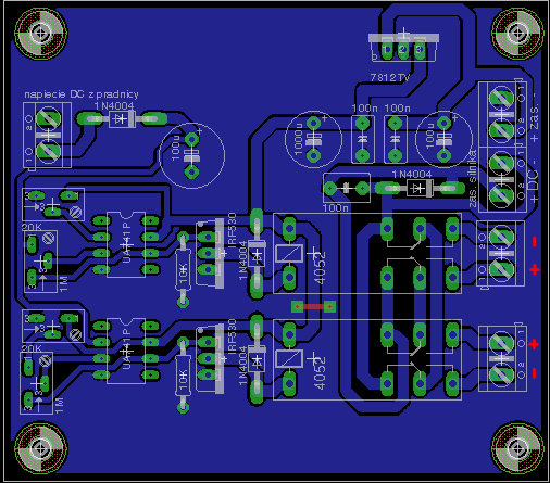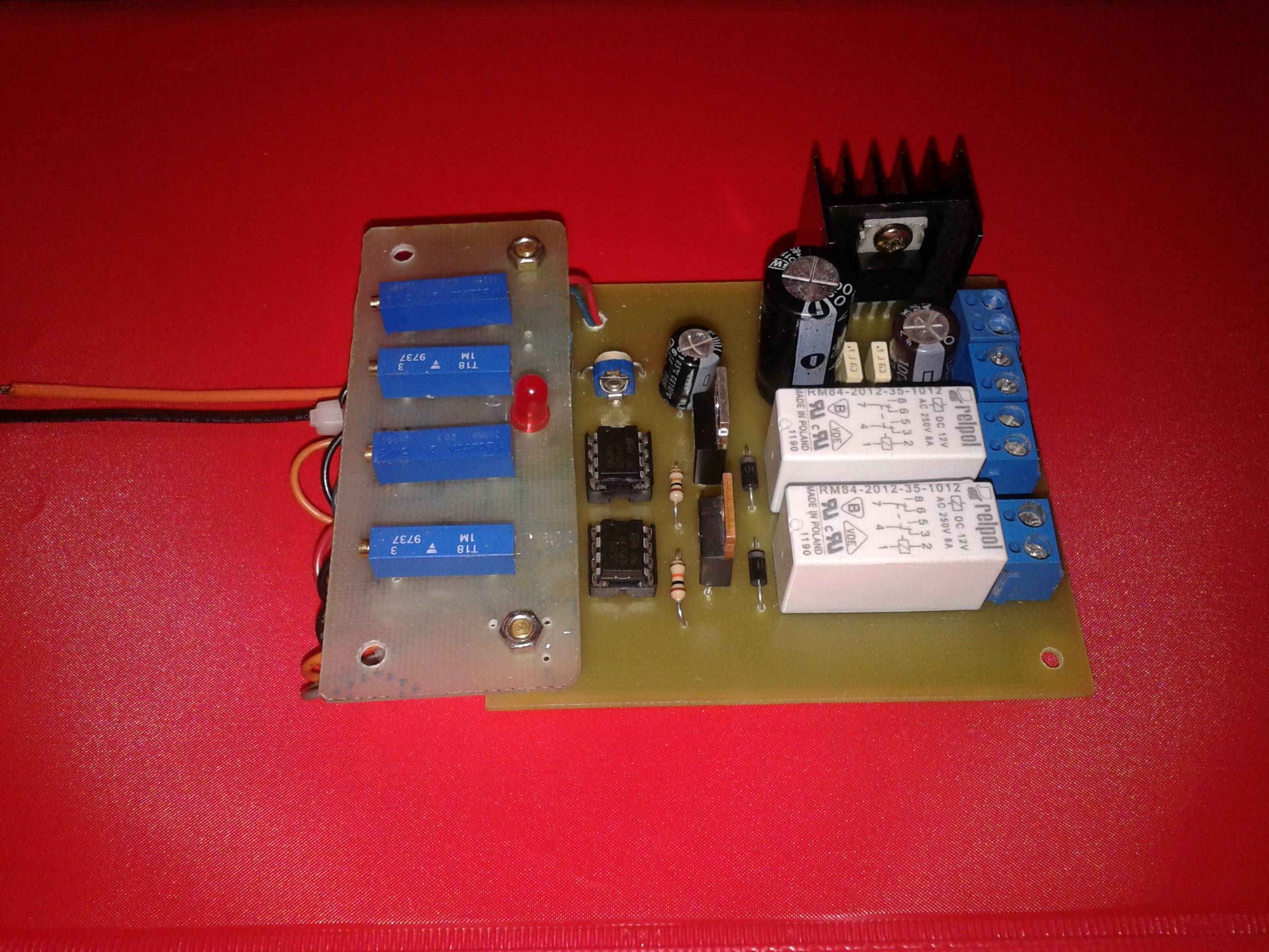 Układ poprawiony i dokończony. Wymieniłem przekaźniki na RM 84, dodałem dzielnik, diodę sygnalizującą pracę układu. Układ podłączyłem do zasilania. Nic nie wystrzeliło, nie dymiło ;) , nic się nie grzeje. Do prądnicy nie podłączałem bo u mnie drugi tydzień bez wiatru :evil:. Muszę się podłączyć z układem do jakiegoś zasilacza regulowanego, bo inaczej go nie wyskaluje. Waldek, co do podłączenia siłownika, to myślałem tak samo jak Ty. Musi w ten sposób zadziałać, bo oba przekaźniki raczej nigdy nie będą działać w tym samym czasie. Jeśli napięcie z prądnicy przekroczy wyznaczoną wartość, to zadziała PR1 (prawe obroty), siłownik złoży ogon (w tym czasie PR2 nie pracuje). Gdy napięcie spadnie do dozwolonego, zadziała PR2 (lewe obroty), siłownik nastawi wiatrak do wiatru. Chyba tak to ma działać. Dołączam foto układu już poprawionego.