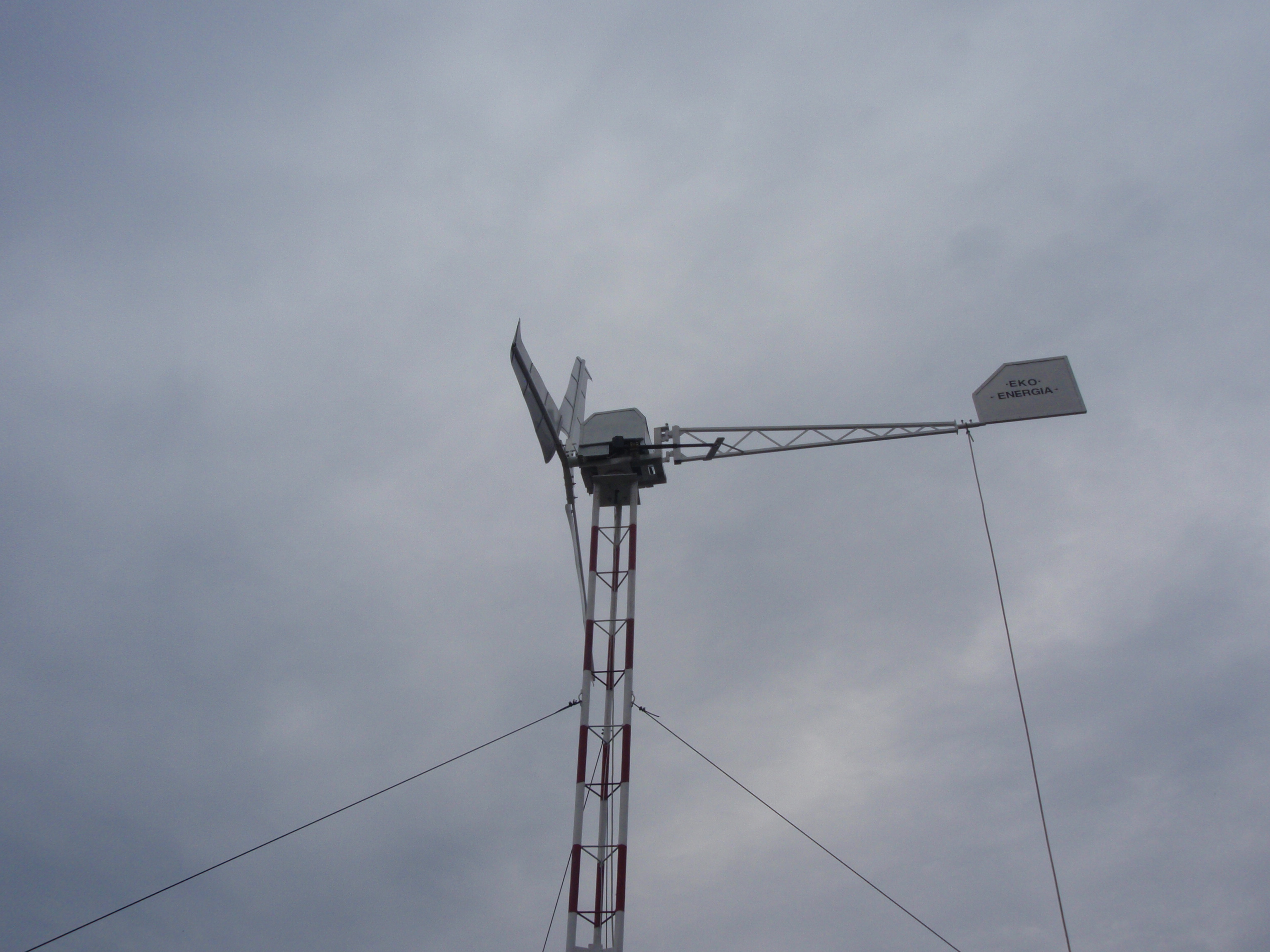 Tak wyglądał mój wiatrak w fazie budowy, na zdjeciu widoczny jest siłownik do sterowania ogona, a na drugim już złozony w fazie testów. Teraz podwyższam maszt do 10,5m, bo na 8m wiatrak za bardzo myszkuje. Zbyt blisko zabudowań, które są wyższe od mojego masztu.