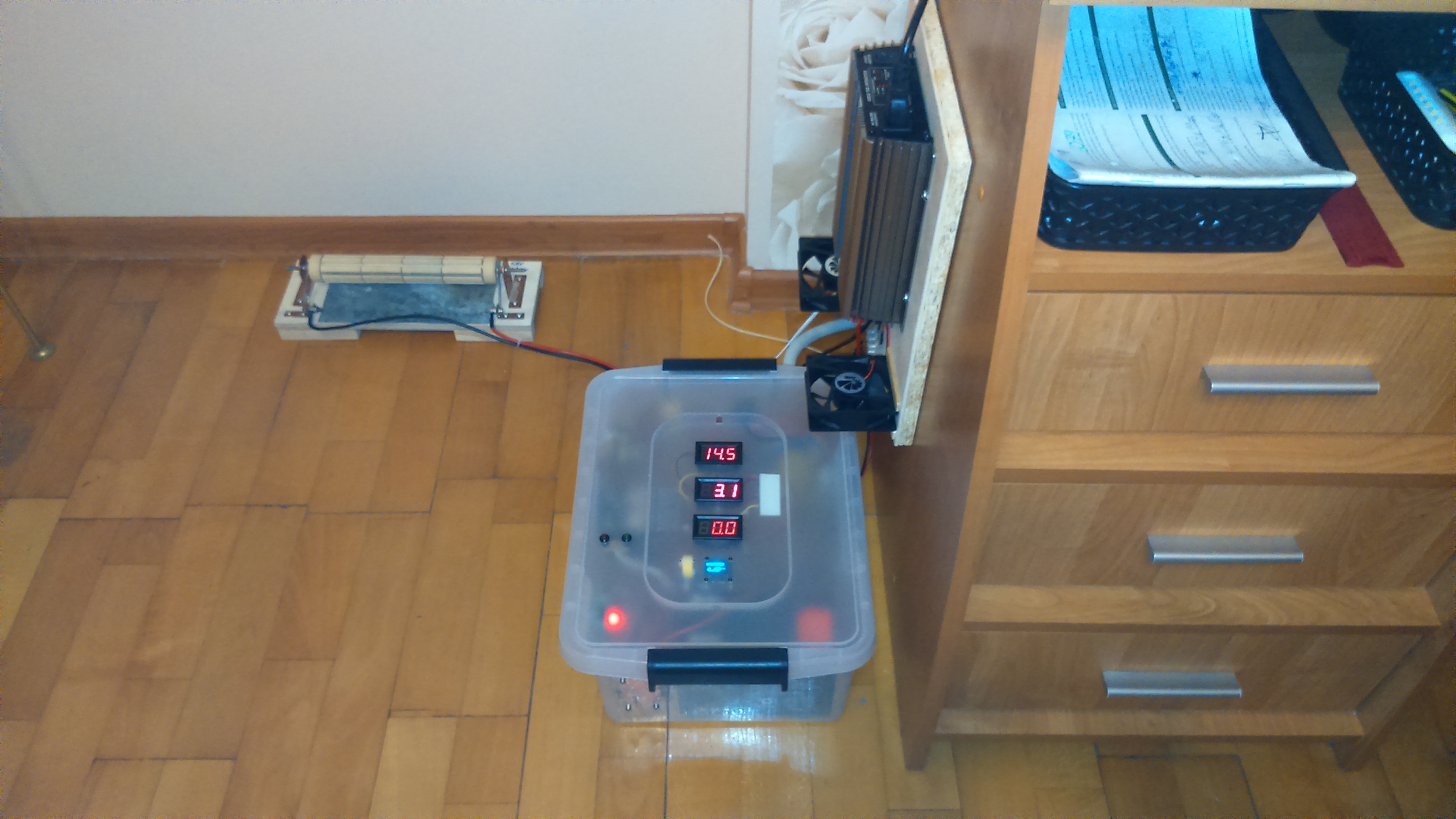 Każdy z trzech elementów opornicy będzie miał moc 300W przy 58V. Opór każdego z kawałków to 11,2 Ohm, a obciążenie powierzchniowe to 9,1W/cm2(według kalkulatora http://www.artom.com.pl/Promienniki/0013.htm).