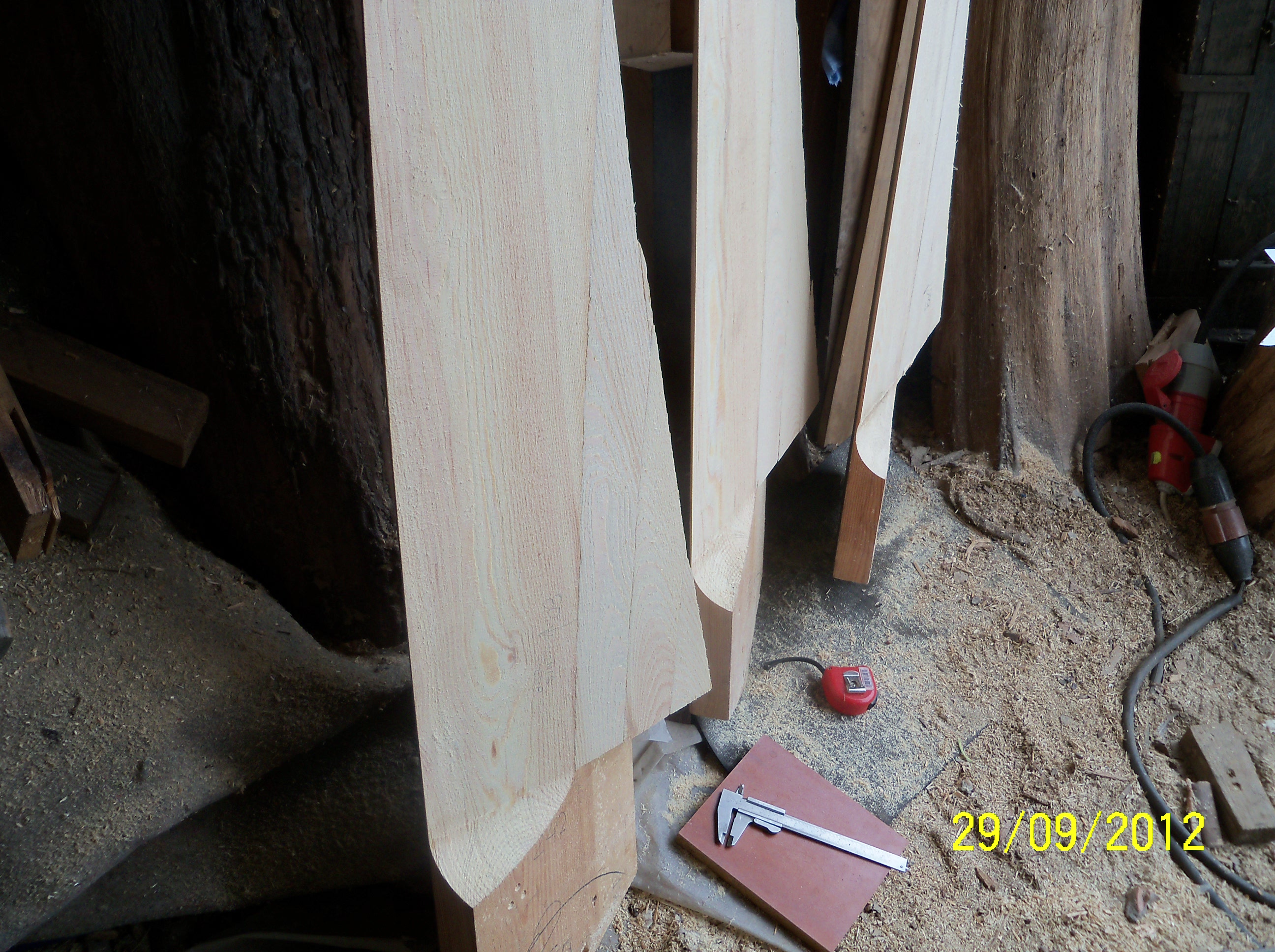 Jak widzę z fotek to śmigła są z solidnej sosny. Wytrwała obróbka jest również widoczna. Część szersza od strony osi obrotu jest w porządku. Ja bym popracował jednak nad końcem łopaty, tym węższym. Zmniejszył bym tą grubość mierzoną przez suwmiarkę z 12.5 na 8-9 mm. Maksymalne zgrubienie powinno być w odległości około 25 do 30% od krawędzi natarcia. Przekrój będzie bardziej opływowy a tum samym śmigło szybsze. Całą operację przeprowadziłbym na długości około 350 do 400 mm od najcieńszego końca próbując płynnie przejść do istniejącego już dalej profilu. Oczywiście zachować dotychczasową szerokość a nadmiar materiału zbierać od strony zawietrznej.