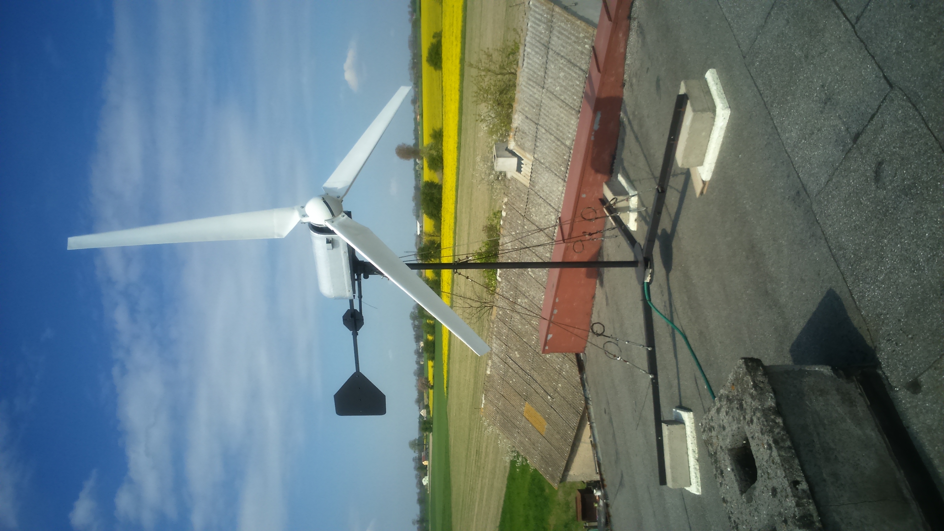 Turbina ogólnie stoi na trójnogu na dachu niczym nie zakotwiczona, ale trzyma ją 6 kanoldów, I żeby za maszt podnieść jedną nogę do góry to potrzeba ze dwóch ludzi do pchania.