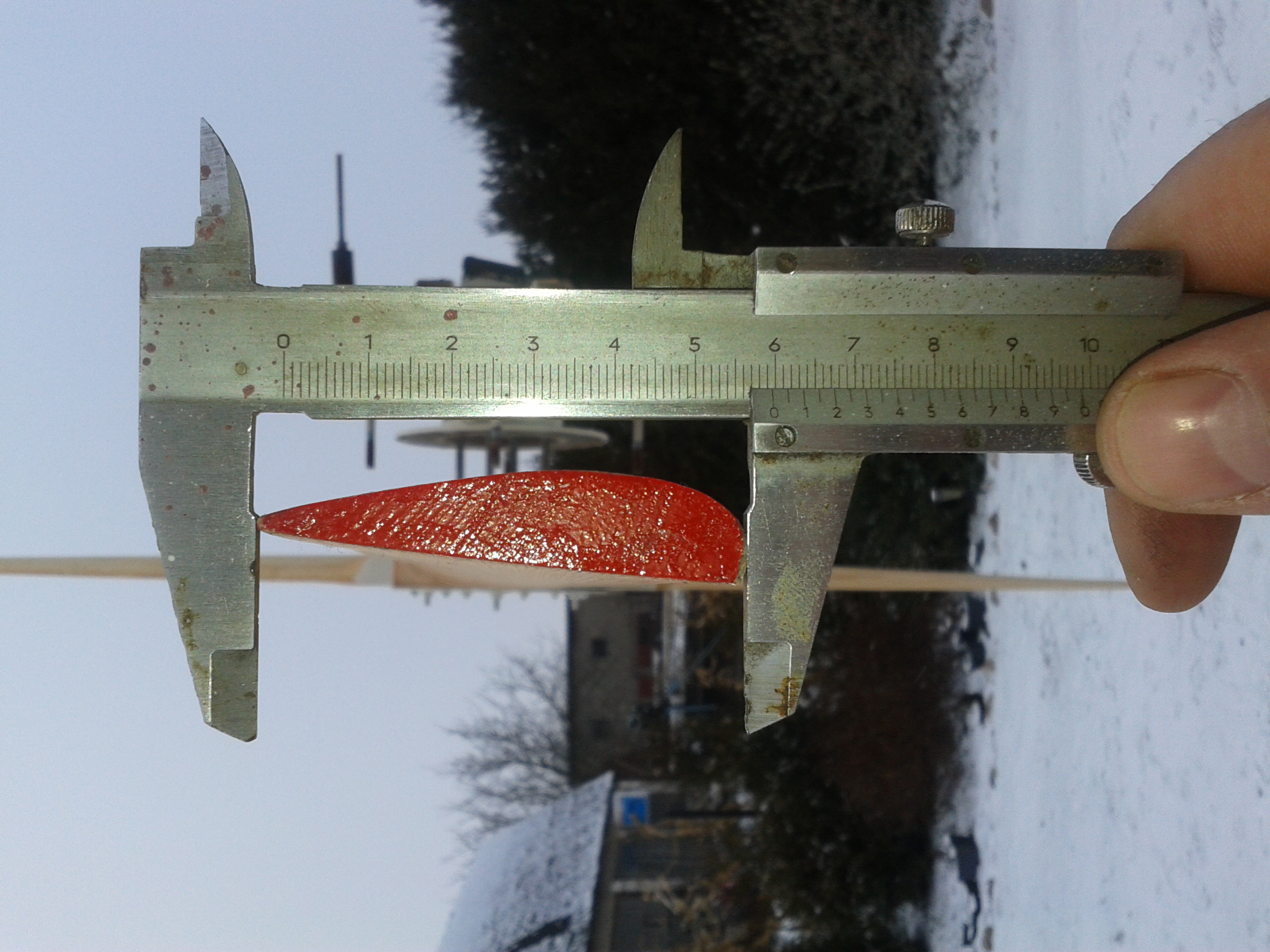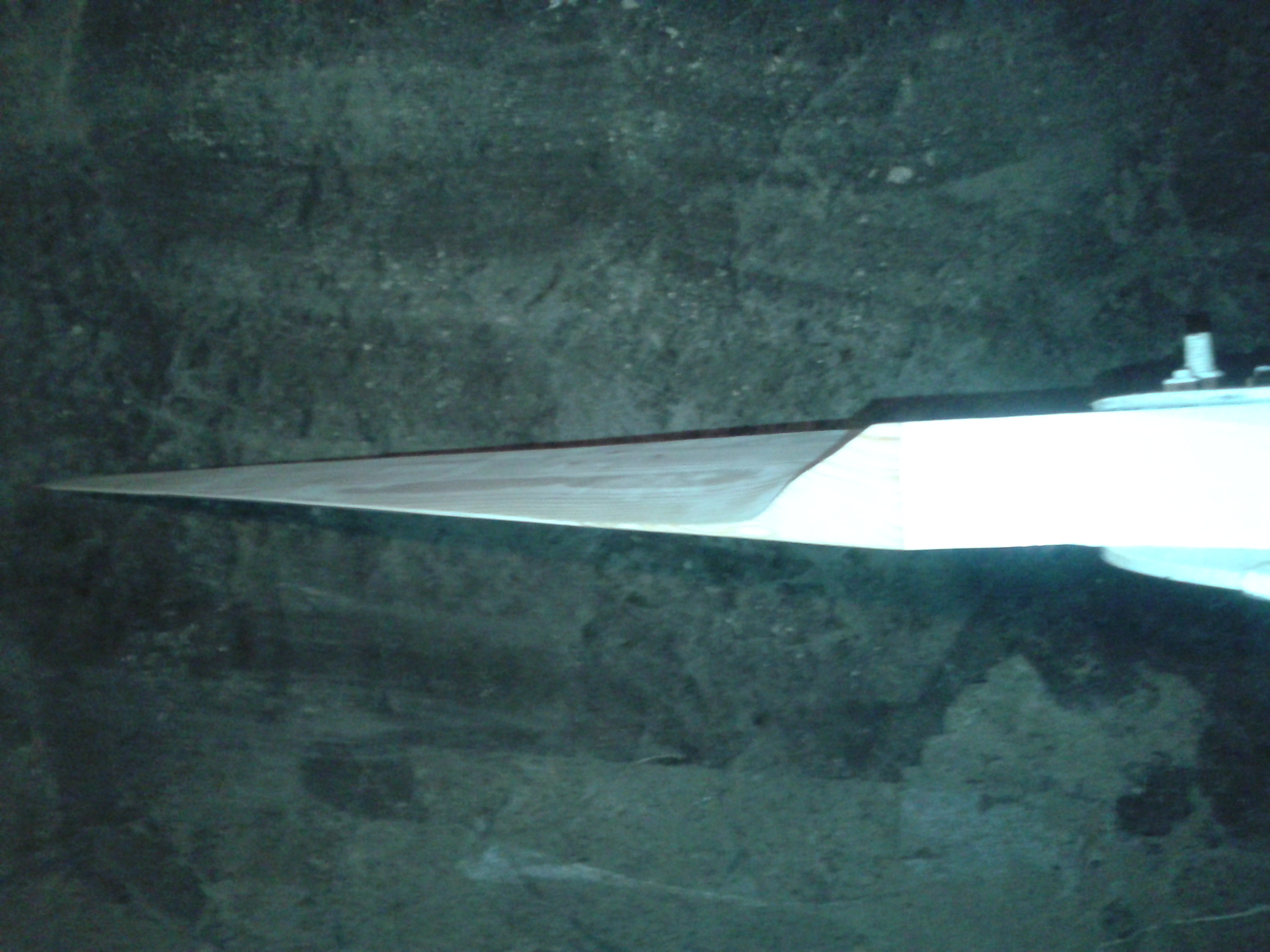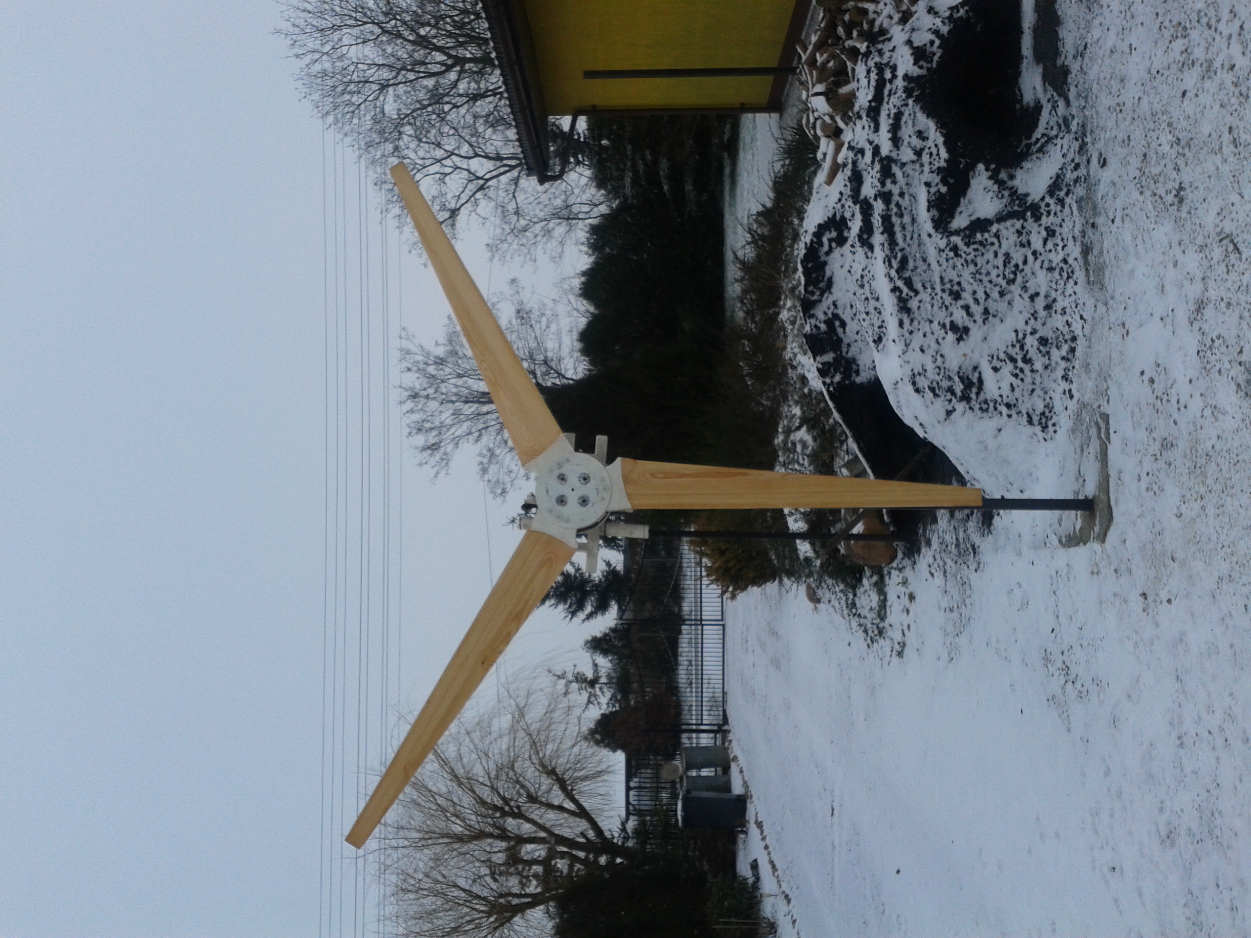 Dopracowałem też moje śmigło, które niegdyś pracowało przy mojej amerykance. Teraz będzie pracowało zamiast śmigieł z rury PCV. Śmigło z drewna sosnowego sezonowanego, o jednolitych słojach (ma tylko jednego małego sęczka), średnicy 2,5m po złożeniu w całość. Jedna łopata (część pracująca) ma długość 1,2 m. U nasady szerokość 180 mm, grubość 40mm, na końcu szerokość 60mm, grubość 12 mm.Do jego wykonania użyłem: grubościówki, piłki ręcznej do drewna, struga stolarskiego, szlifierki kątowej z tarczą do szlifowania drewna oraz uchwytu uniwersalnego do szlifowania papierem ściernym. Dane do wykonania łopaty pochodzą z jakiejś anglojęzycznej strony (były w calach). Łopaty były konserwowane podgrzanym pokostem lnianym i lakierem poliuretanowym o wysokiej odporności na czynniki zewnętrzne. Pomalowane białą farbą do drewna, która została teraz zeszlifowana w celu dopracowania niedociągnięć. Śmigła ponownie zostały zabezpieczone lakierem. Dzisiaj było prawie bezwietrznie, więc udało mi się je wstępnie wyważyć. Były ustawione bokiem do kierunku wiatru( widać było po dymie z komina), a mimo tego po wyważeniu przy niewielkim wiaterku startowały. :) Czekają na ponowne malowanie na biało, ale jest mróz i muszą poczekać. Końcówki pomalowałem na czerwono aby lepiej oddały swój kształt na fotkach. Tak wygladają ;)