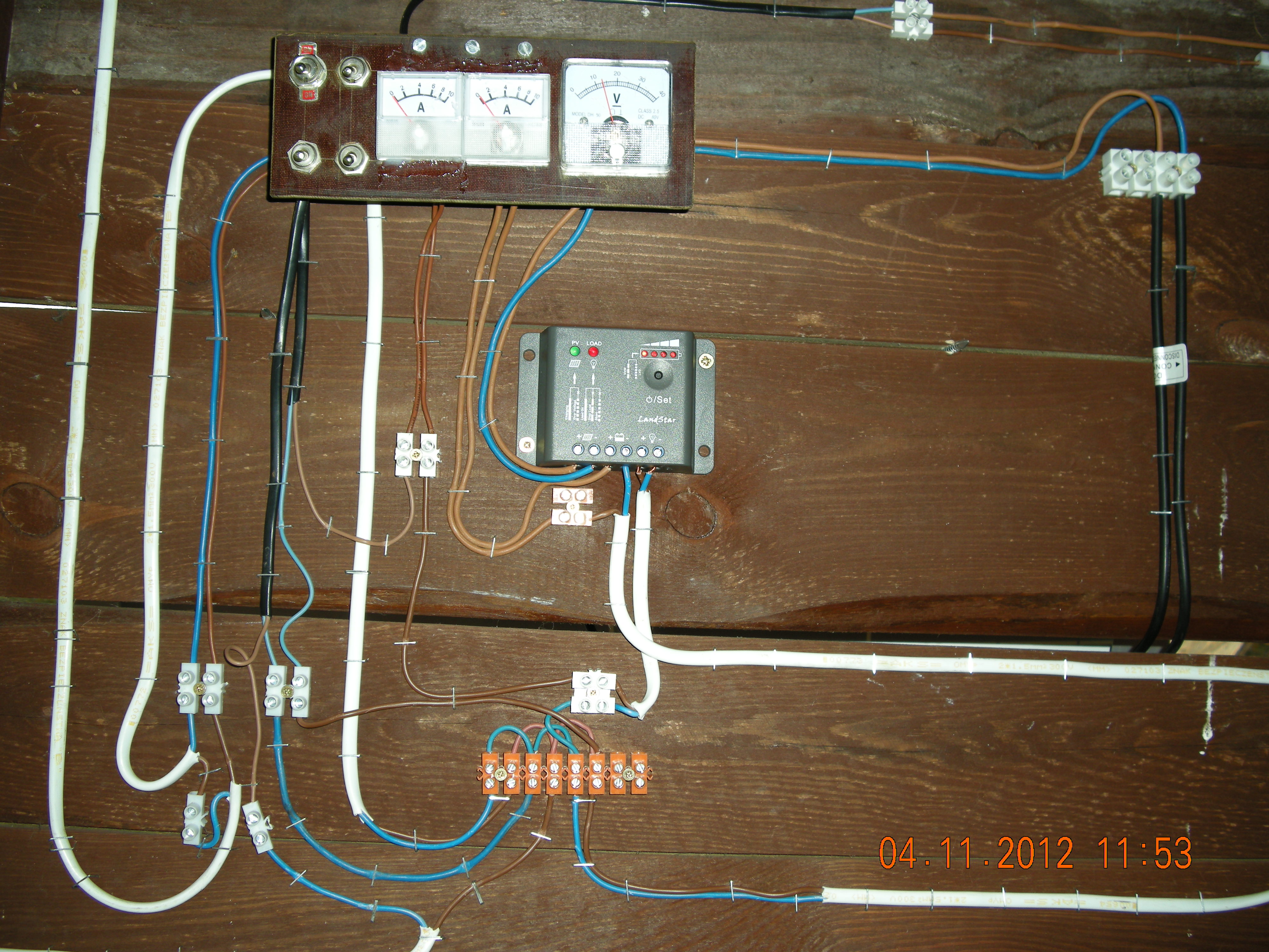 Lewy amperomierz pokazuje mi ile żrą odbiorniki. Prawy jaki jest prąd ładowania aku. Woltomierz pokazuje napięcie które idzie na aku(nie napięcie panela gdyż te jest około 20V nawet w pochmurną pogodę) Lewy górny włącznik to włącznik główny odbiorników. Reszta włączników to podzielone na sekcje włączanie odbiorników w moim przypadku oświetlenie. Na zdjęciu widać też taśmę led pod dachem domku narzędziowego. Oświetla wnętrze i szczerze odradzam listwy led! 2.5 m listwa zżera mi 2A i nie wiem czy to jest normalne czy po prostu coś mi się tam zwiera bo żarówka led 60 smd 3,5W pobiera mi 0.4A. Wszystko jak widać połączone jest na kostki, czy listwy łączeniowe a to dla tego aby w każdej chwili w razie awarii można było to wypiąć, wykręcić uszkodzony element i przykręcić sprawny. Jeszcze taka rada podparta doświadczeniem. Mam panel 50W i aku 100Ah i to nie ma sensu ponieważ ładowanie aku jest rzędu 0.5-2,5A więc nigdy ten aku mi się nie naładuje. Mam drugie aku 52Ah a że ma 3 lata i niestety trochę osłabł i w aucie już się nie nadaje ale mój panel jest w stanie go naładować do pełna przy ładnej pogodzie. Morał z tego taki że im większy aku to wcale nie jest lepiej. Trzeba dopasować aku do panela i myślę że najprostszym sposobem jest pomnożyć maksymalny prąd wytwarzany przez panel razy 10i dodać na wszelki wypadek jakieś 20-30%, czyli panel 50W ma maksymalnie około 3A więc 3A x10=30Ah dodać do tego jakąś rezerwę i wychodzi 40-45AH max.Większego nie naładuje. Dlaczego ktoś spyta? No po prostu dedykowane przez producentów aku ładowanie wynosi 1/10 pojemności aku. Czyli jak mamy aku 40 Ah to ładowanie powinno wynosić 40:10=4A.Jednak wiem z doświadczenia że wartość podana na aku jest jedynie domyślną i biorę na to poprawki. Zauważcie że wymieniając np amortyzatory w aucie na nówki powinny w teście mieś 100% sprawności. Niestety tak nie jest bo będą miały około 90% sprawności. Tak samo jest z aku które niby ma 50Ah a tak naprawdę ma trochę mniej a jeszcze jeśli jest kiepsko użytkowane to już jego sprawność spada.Lepiej więc mieć naładowany na maxa mniejszy aku niż niedoładowany większy. LONIC.
