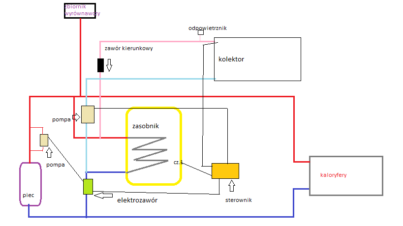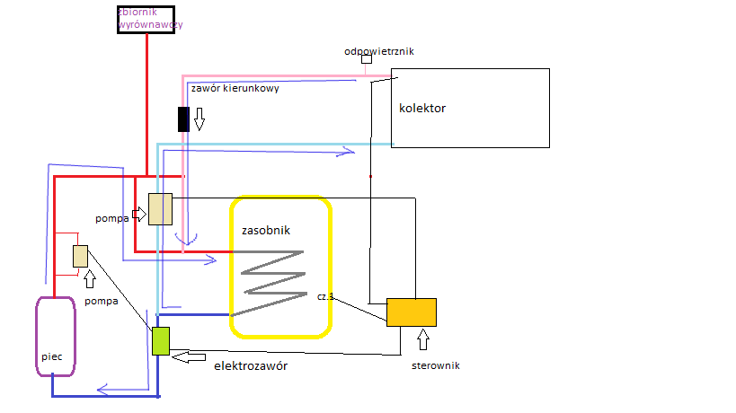 Witam po małej przerwie nasuwają mi się parę pytań. Zaczynając od początku układ jest otwarty i ma działać na sezon letni. Głównym zadaniem kolektora ma nagrzewać zasobnik a w "razie" zbytniego nagrzania wody w kolektorze otworzenie elektrozaworu i przepuszczenie wody przez cały układ centralny. W czasie korzystania z pieca sterownik przy uzyskaniu odpowiedniej temp. załącza pompę obiegową i pod nią chciałem podłączyć elektrozawór aby działało nagrzewanie zasobnika. Podczas korzystania z kolektora piec będzie wyłączony i na odwrót tak że elektrozawór nie będzie dostawał "błędnych informacji". na zasileniu ciepłej wody nie chce dawać żadnego zaworu aby kolektor w razie czego wyrównał stan wody tak że połączenie układu kolektora i centralnego "nie będzie" zaworu. Mam nadzieje że trochę nie zamotałem i że koledzy mi trochę pomogą