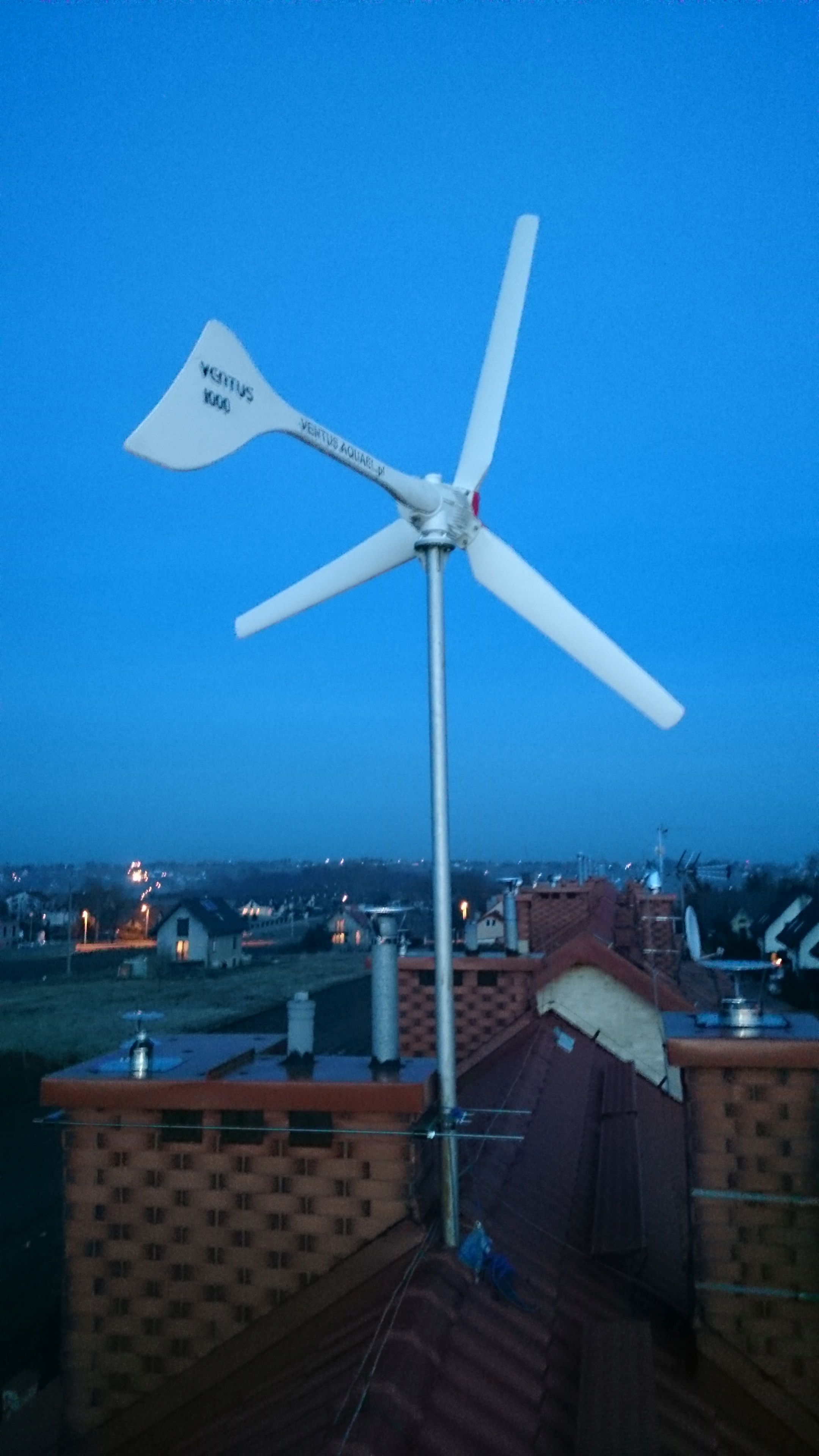 Jest to mój pierwszy post, ponieważ próbuje dołączyć do grona zakreconych na punkcie OZE - montują swoją pierwsza turbine na budynku. Mieszakam w zabudowie szeregowej i jedyną możliwości montażu turbiny jest dach. Wykonałem maszt o długości 6m z rury 76mm/6,3. Maszt ustawiłem na poddaszu i wystawiłem do przy kominie ponad dach. W sumie 3m sa w domu i 3m ponad dachem. Na szczycie zamontowałem turbine VENTUS 1000 i średnicy wirnika 2,8m. Turbina pięknie działa z mocą do 1kW przy wiatrach do 10 m/s. Jedynym problemem jest uciążliwość wewnątrz budynku - drgania niosą się po całym budynku i jeżeli ich nie wyeliminuje będę zmuszony zdemontować turbinę.