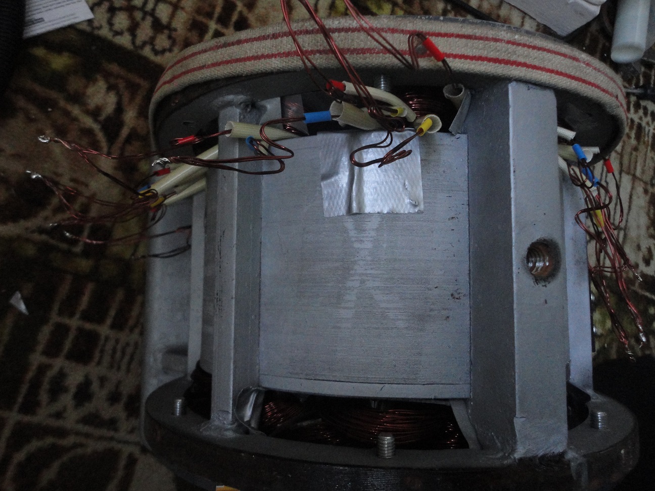W mojej konstrukcji jak widać wyprowadzenie polączeń cewek jest na zewnątrz stojana więc moge zrobić pomiary oraz ewentualnie inaczej połączyć uzwojenie bez rozkładania samej prądnicy.Dodatkowo fazy oznaczyłem kolorami a różne "nogi" cewek różnej średnicy koszulkami wysokotemperaturowymi.