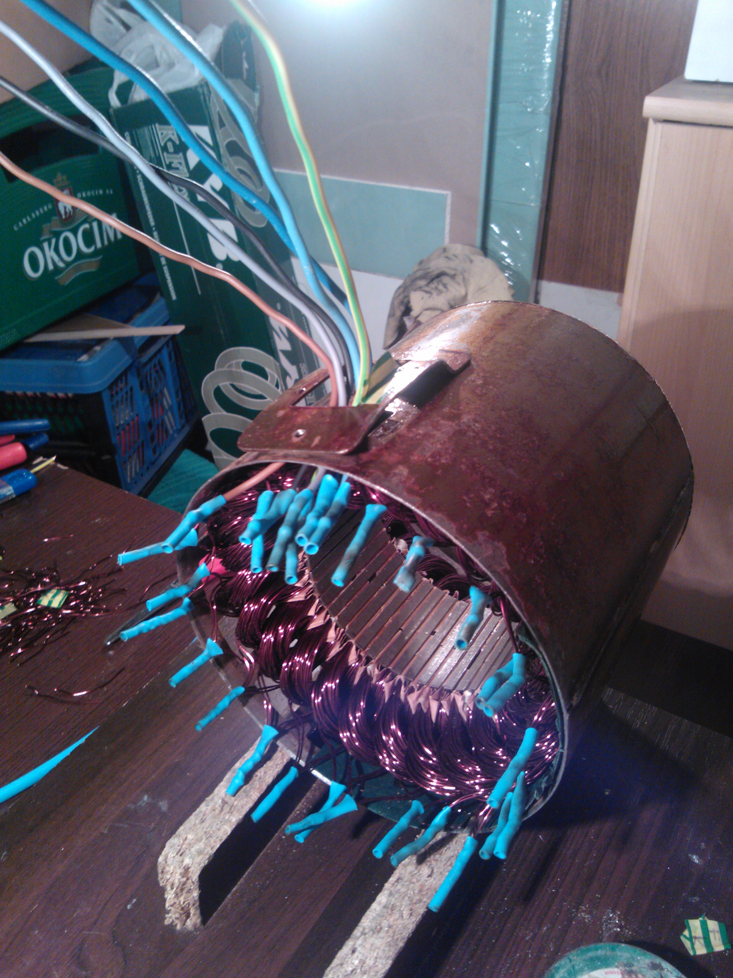 Wczoraj skończyłem uzwajać stojan ale teraz mam trochę niejasności tzn.chodzi o to iż patrząc na stojan od strony kola pasowego,wkładałem cewki po kolei w przeciwnym kierunku do wskazówek zegara i koniec cewki jest w prawym żłobku w górnej części żłobka a początek cewki w lewym na spodzie żłobka.Czytam tutaj na forum że należy łączyć cewki w fazie K+P,K+P,K+P itd w prawo .Czy to oznacza że zgodnie z ruchem wskazówek zegara?Na zdjęciu drut zagięty jest początkiem cewki a prosty to koniec cewki.Czy mógł by ktoś rozwiać moje wątpliwości czy ja w ogóle to dobrze włożyłem?Teraz mam wątpliwość ale liczę na pomoc kolegów.