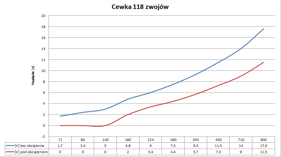 Witam Panowie. Wczoraj dokonałem pomiarów testowej cewki na tokarce. Dodam, że obciążeniem była żarówka 12V 35W. Oto jakie wyszły mi wyniki: