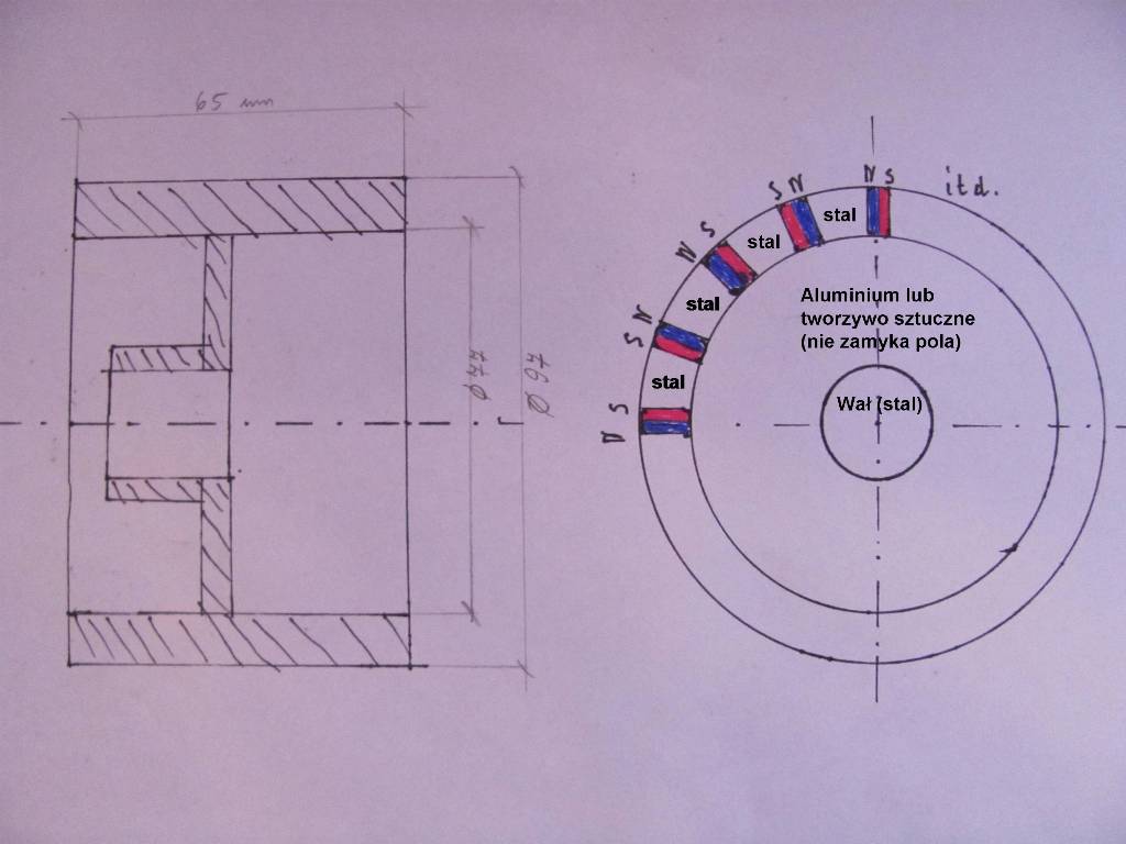 panowie. mnie chodzi o rozmieszczenie magnesów nie o to czy wirnik ma być pełny czy nie. w tych linkach co podałem magnesy są na "sztorc" a nie na płasko naklejone na wirnik. tak jak pisali na elektrodzie na pewno można zmniejszyć szczelinę do minimum. z pewnością będzie mniejsza niż przy tradycyjnym wirniku. głownie chodzi mi o sprawność takiego ułożenia magnesów. na marginesie, wirnik nie może być pełny bo pole zamknie się przez wirnik a nie przez stojan(uzwojenie). chodzi mi sprawność takiego okładu w stosunku do tradycyjnego. pozdrawiam.