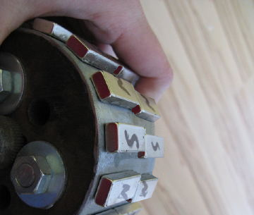teraz odkleiłam magnesy musze dać wirnik do stoszenia (aby po skośie się zmieściły) i póżniej się będę męczyć, a może powinna być większa przerwa pomiędzy stojanami a magnesem??