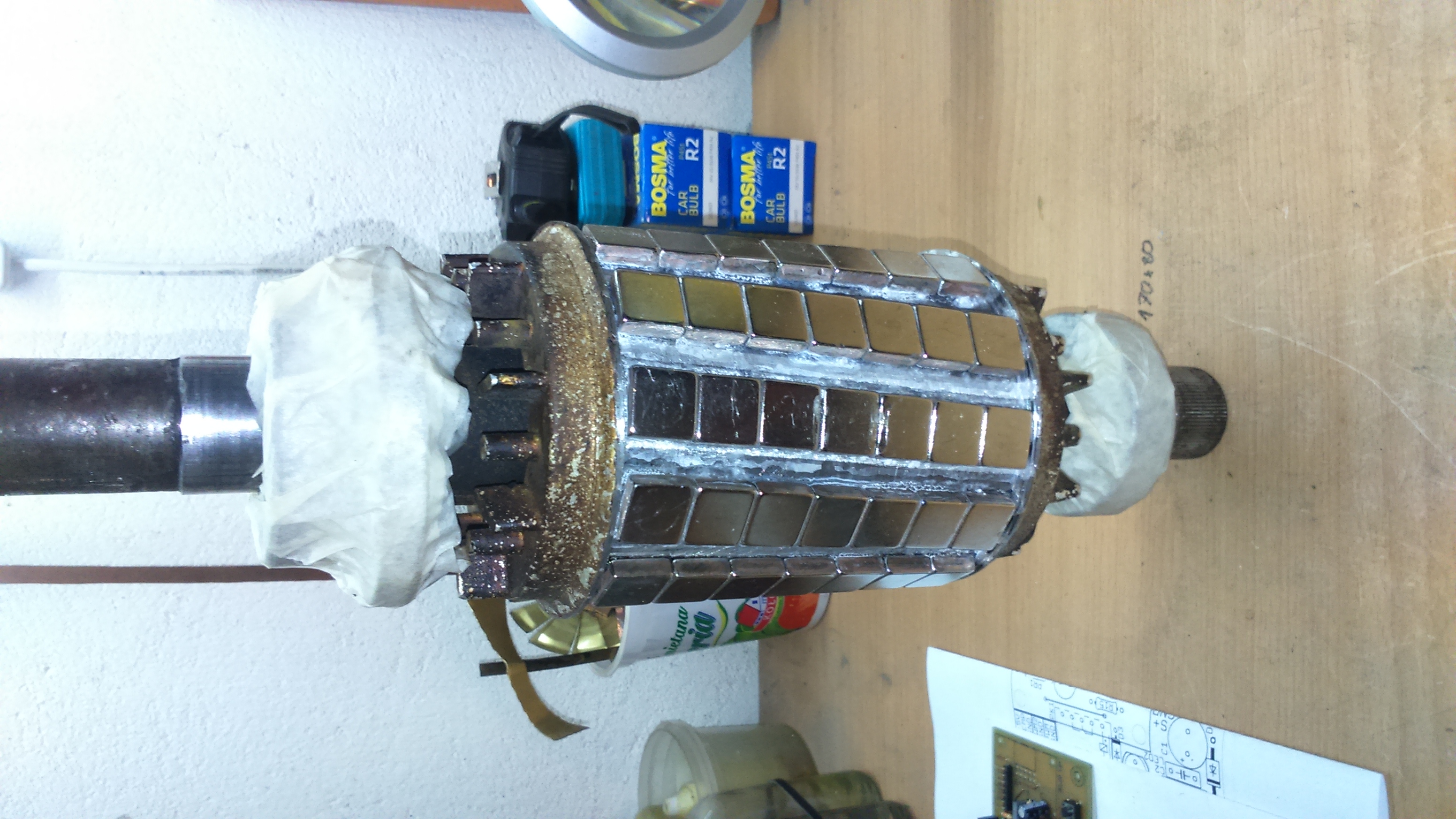 No i magnesy ładnie przyklejone, przetoczone i wirnik w stojanie. Jestem zadowolony, bez problemu ręką obracam wirnikiem w silniku. Są wyczuwalne małe zaskoki, jak i przy pierwszym ruchu trzeba lekko użyć siły, ale to jest w pełni akceptowalne.