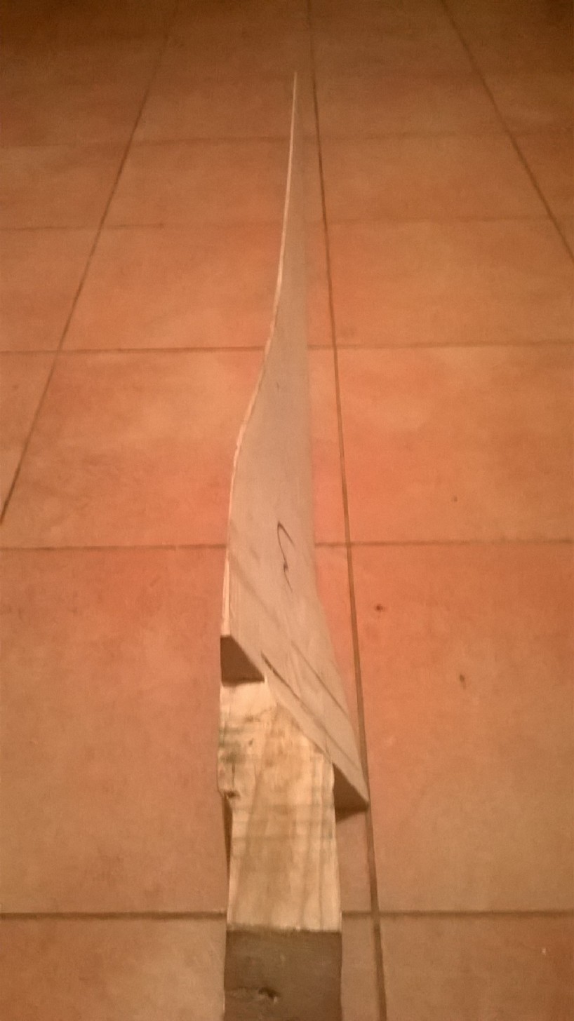 Śmigiełka 3m maja napędzać prądnice z silnika od wiatki która przypuszczalnie ma osiągać max ok 350W, czyli potrzeba do tego wiaterku ok 23km/h obroty śmigła osiągają wtedy ok 320obr/min (oczywiście obroty podane przez program i to prawdopodobnie bez obciążenia). Materiał to krokwie jodłowe o wym 150x15x6,5cm. Wykonane w oparciu o dane z programu wiatrak, postawiłem na szybkobieżność i wybrałem Z=8, obrys trapezowy w najszerszym miejscu 19cm końcówka 10cm.Wewnętrzna średnica części roboczej wynosi 40cm ,największy kąt u podstawy jaki udało mi się uzyskać przez doklejenie u podstawy to 26 stopni i tak w odległości 20-40 od osi obrotu są zmiany w kątach względem tych z programu ponieważ materiał nie pozwalał na uzyskanie większych kątów dlatego wyszło jak wyszło, kąt końcówki zrobiłem ok 2 stopni (celowo zmniejszyłem żeby później zmieniać kąt przy mocowaniu z zachowaniem parametrów z programu).