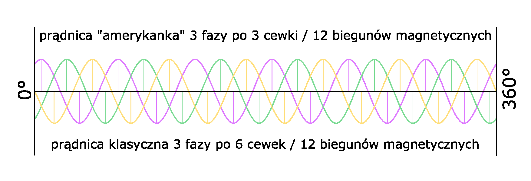 Tutaj masz przebieg napięć podczas jednego obrotu wirnika typowej prądnicy trójfazowej przy 12 biegunach magnetycznych (50Hz @ 500obr/min):