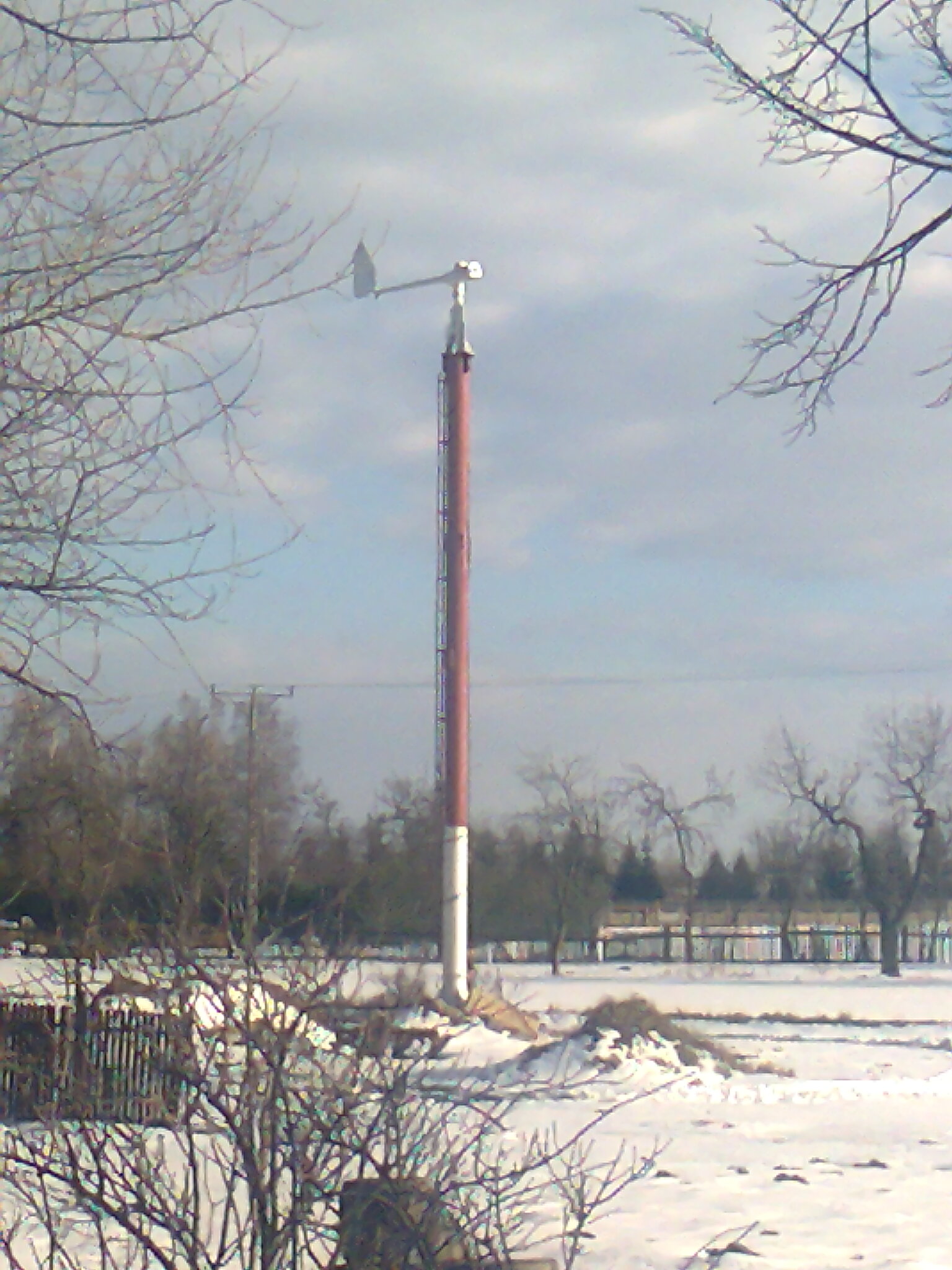 Jest ona za montowana na starym kominie od kotłowni szklarniowej o średnicy 500 mm wysokość masztu 17 m. Jak widać na zdjęciu niema żadnych odciągów .
