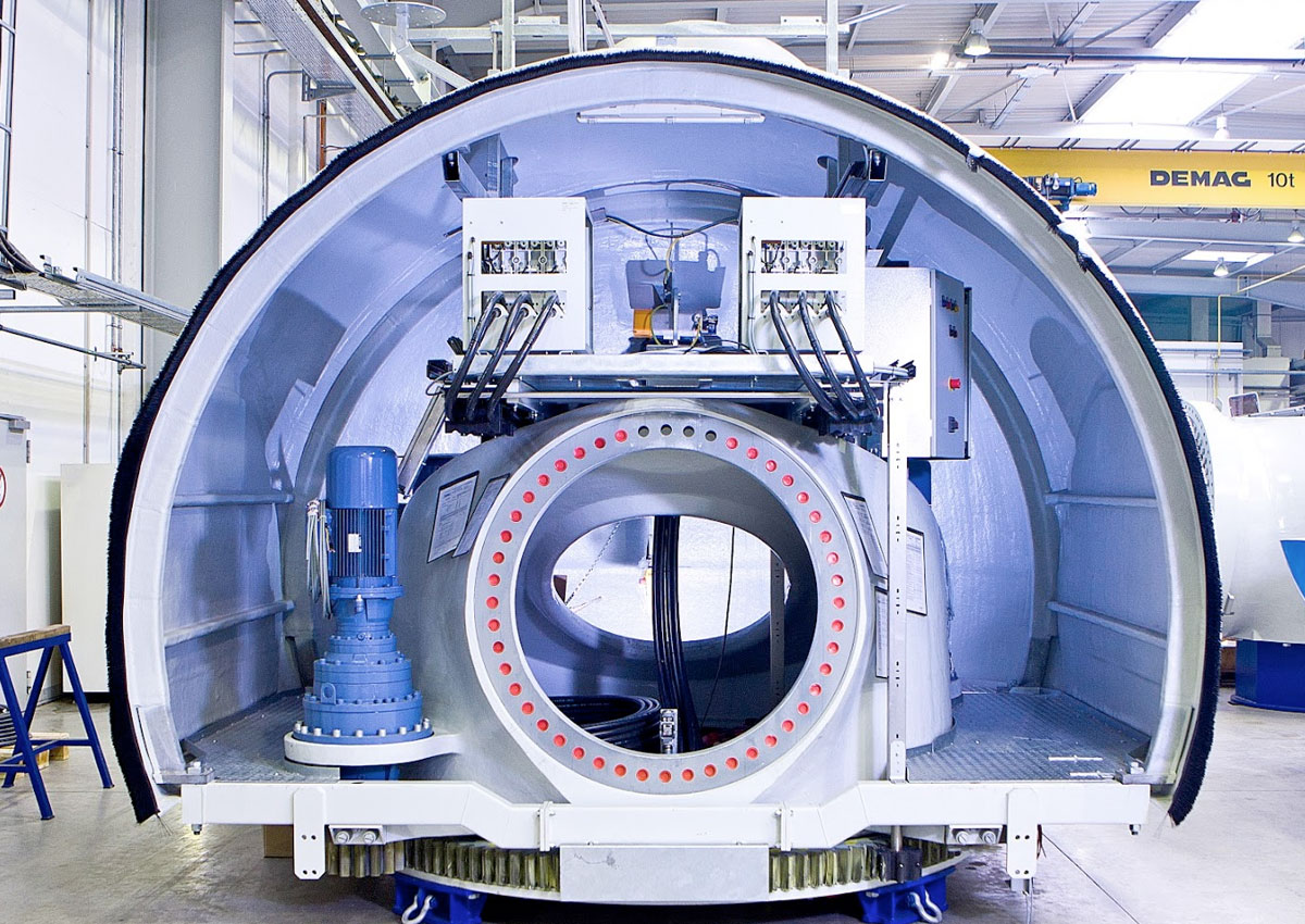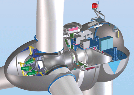 W pierwszej wersji silnik obrotu mial byc w gondoli . Jednak w drugiej wersji będzie w maszcie bo uzębienie jest wewnątrz.
