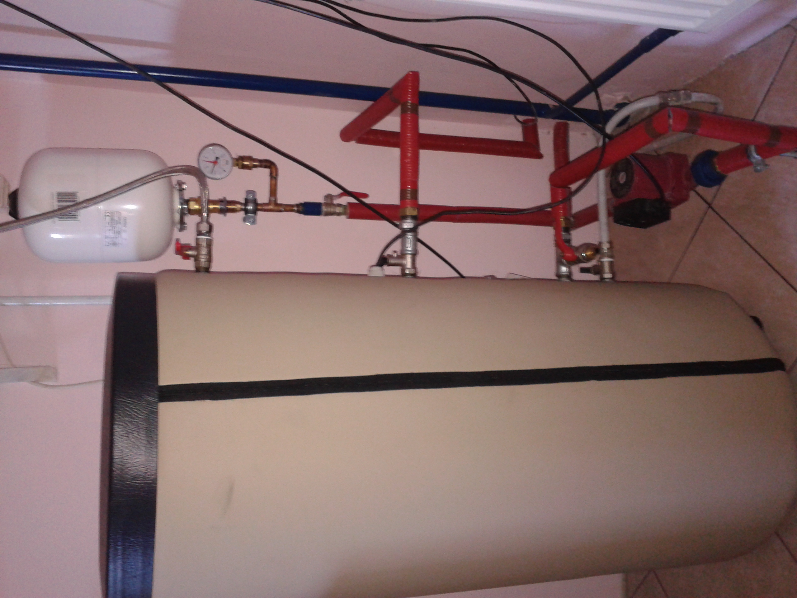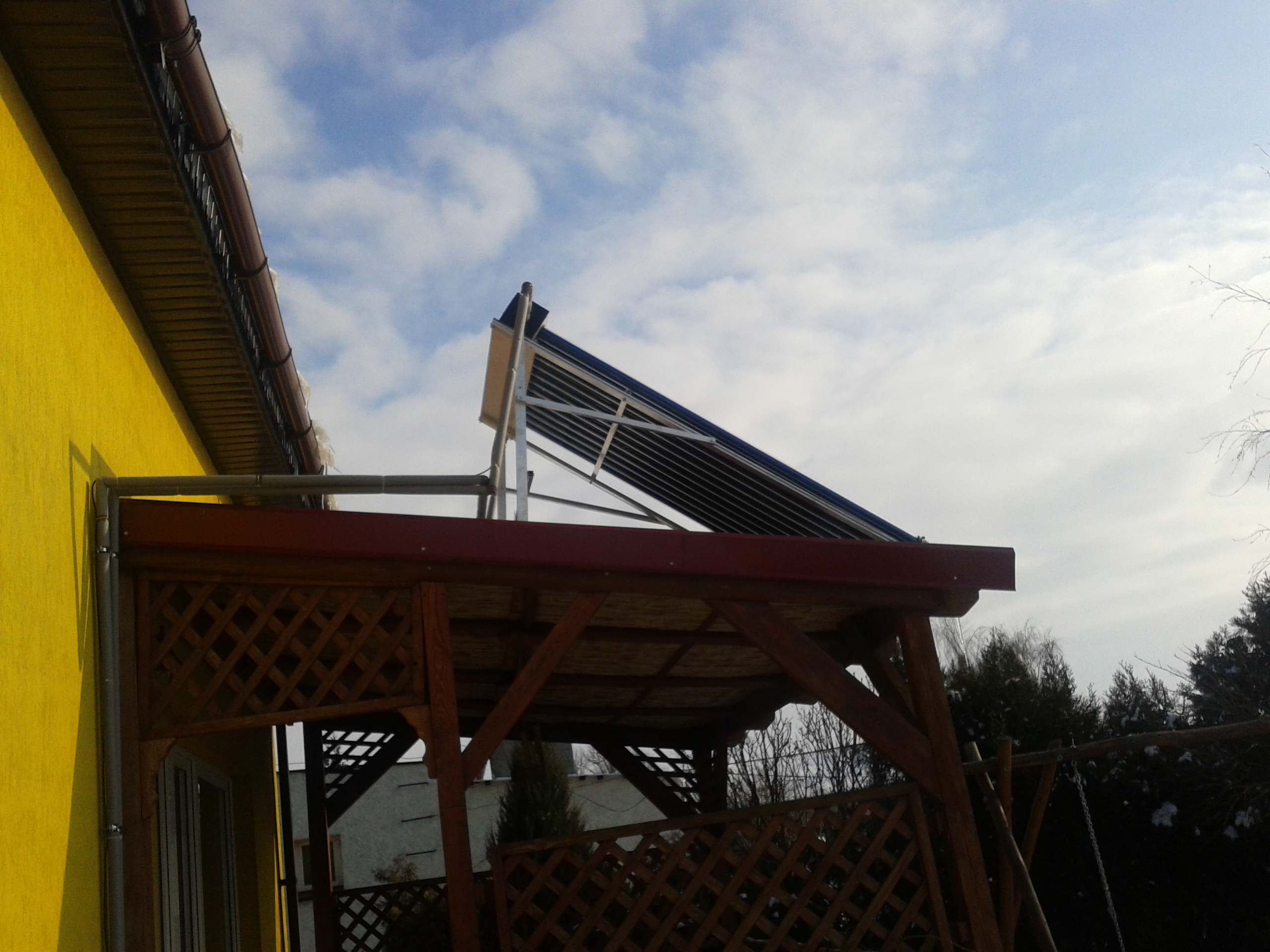 To znaczy wymieniłem zasobnik na większy 120 litrowy solarny z jedną wężownicą o mocy 0,96 KW (do pieca mam drugi bojler), docieplony w obudowie typu skaj z firmy Metalbech Tarach w cenie 820 zł oraz zainwestowałem w kolektor próżniowy składający się z 12 rur heat-pipe, zakupiony u producenta w Koninie w cenie 1200 zł wraz ze stelażem aluminiowym. Zmuszony też byłem do drobnej przeróbki układu, gdyż kolektor z uwagi na prostotę montażu i niewielką wagę został umieszczony na dachu altany, tak, że słońce dostępne jest w tym miejscu od godziny 9.00. Zaletą tego kolektora jest to, że jest on wydajniejszy od innych o około 30%, dzięki zastosowaniu absorbera o kolorze ciemno granatowym, gdzie w innych rurach powszechnie ma kolor błękitny. Rurki te nagrzewają się do temperatury 300 stopni i w słoneczne dni pełną moc osiągają w czasie 2 minut (dane producenta). Panel działa również w dni pochmurne, gdyż w rurce znajduje się niewielka ilość substancji, która paruje już w temperaturze +25 stopni, a do jej uzyskania jest potrzebna mała ilość energii. Zapewnia to pracę kolektora w okresie jesiennym oraz wczesnowiosennym, a nawet w mroźne dni kiedy z za chmur wychodzi słońce. Przykładem był dzień dzisiejszy. Temperatura powietrza 5 stopni poniżej zera, a w kolektorze dochodziła do 51 stopni powyżej zera na wyjściu (pewnie mogła być wyższa. ale mam ustawiony próg załączenia pompki obiegowej na 45 stopni). O godzinie 9.00 temperatura w wymienniku wynosiła 29 stopni, a o godzinie 15.00 42 stopnie.