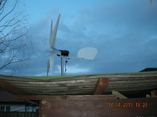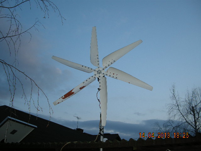 Bateria jest przykręcona i trzyma się solidnie ten patyk to takie w razie czego podłożyłem i teraz nie chce mi się tego zmieniać. Dzisiaj wiatraczek kręci się cały czas. Na razie jest na 4 metrach i pewnie nieprędko to się zmieni bo nie chcę tak od razu na maxa drażnić sąsiadów. Niech się na razie przyzwyczają to potem nie zauważą że maszt powędrował trochę w górę. Jest w takim miejscu gdzie ciągle wieje, ale mocy wiaterek tam nie ma największej. Prądnica jest z silnika do bieżni na ferrytach z komutatorem i szczotkami. Pracuje bezszelestnie. Naprawdę nic nie słychać. Nie ma zaskoków wogóle. Nawet ten wiatrak przyjemnie wygląda. Jak obuduję i domaluję to będzie to nawet ładna ozdoba. Jak zdejmę do malowania to ją rozbiorę i cyknę fotki. Czekam teraz na regulator i jakieś pomiary porobię. Teraz pytanie. Co by się stało jakby taki wiatrak równolegle podłączyć z panelem do regulatora? I takie pytanie do kolegów elektroników. Ile kosztowałby powielacz napięcia do takiego wiatraka? Tak myślę że potrójne powielenie byłoby najlepszą metodą na wykorzystanie większości słabych wiaterków.