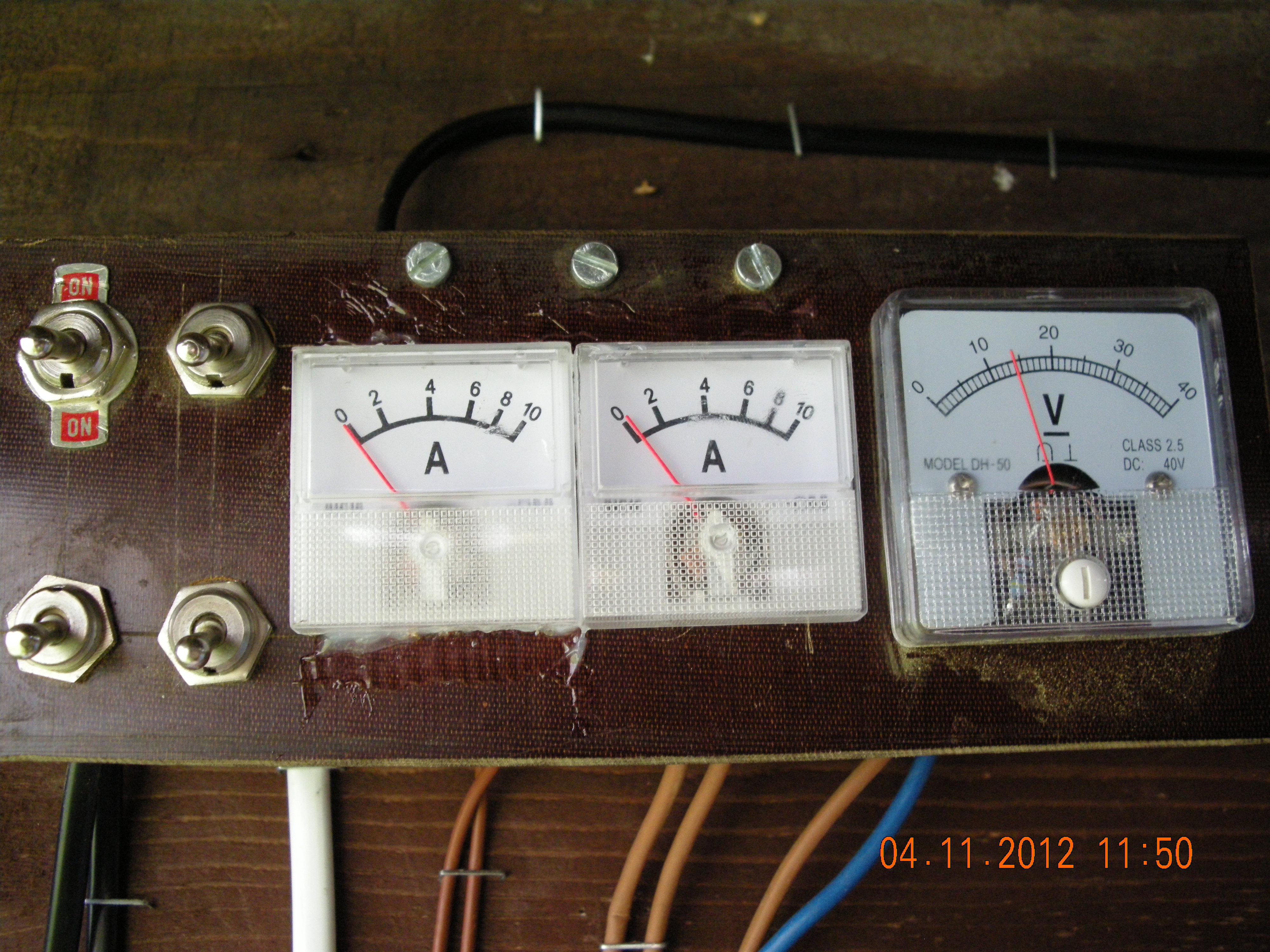 Lewy amperomierz pokazuje mi ile żrą odbiorniki. Prawy jaki jest prąd ładowania aku. Woltomierz pokazuje napięcie które idzie na aku(nie napięcie panela gdyż te jest około 20V nawet w pochmurną pogodę) Lewy górny włącznik to włącznik główny odbiorników. Reszta włączników to podzielone na sekcje włączanie odbiorników w moim przypadku oświetlenie. Na zdjęciu widać też taśmę led pod dachem domku narzędziowego. Oświetla wnętrze i szczerze odradzam listwy led! 2.5 m listwa zżera mi 2A i nie wiem czy to jest normalne czy po prostu coś mi się tam zwiera bo żarówka led 60 smd 3,5W pobiera mi 0.4A. Wszystko jak widać połączone jest na kostki, czy listwy łączeniowe a to dla tego aby w każdej chwili w razie awarii można było to wypiąć, wykręcić uszkodzony element i przykręcić sprawny. Jeszcze taka rada podparta doświadczeniem. Mam panel 50W i aku 100Ah i to nie ma sensu ponieważ ładowanie aku jest rzędu 0.5-2,5A więc nigdy ten aku mi się nie naładuje. Mam drugie aku 52Ah a że ma 3 lata i niestety trochę osłabł i w aucie już się nie nadaje ale mój panel jest w stanie go naładować do pełna przy ładnej pogodzie. Morał z tego taki że im większy aku to wcale nie jest lepiej. Trzeba dopasować aku do panela i myślę że najprostszym sposobem jest pomnożyć maksymalny prąd wytwarzany przez panel razy 10i dodać na wszelki wypadek jakieś 20-30%, czyli panel 50W ma maksymalnie około 3A więc 3A x10=30Ah dodać do tego jakąś rezerwę i wychodzi 40-45AH max.Większego nie naładuje. Dlaczego ktoś spyta? No po prostu dedykowane przez producentów aku ładowanie wynosi 1/10 pojemności aku. Czyli jak mamy aku 40 Ah to ładowanie powinno wynosić 40:10=4A.Jednak wiem z doświadczenia że wartość podana na aku jest jedynie domyślną i biorę na to poprawki. Zauważcie że wymieniając np amortyzatory w aucie na nówki powinny w teście mieś 100% sprawności. Niestety tak nie jest bo będą miały około 90% sprawności. Tak samo jest z aku które niby ma 50Ah a tak naprawdę ma trochę mniej a jeszcze jeśli jest kiepsko użytkowane to już jego sprawność spada.Lepiej więc mieć naładowany na maxa mniejszy aku niż niedoładowany większy. LONIC.