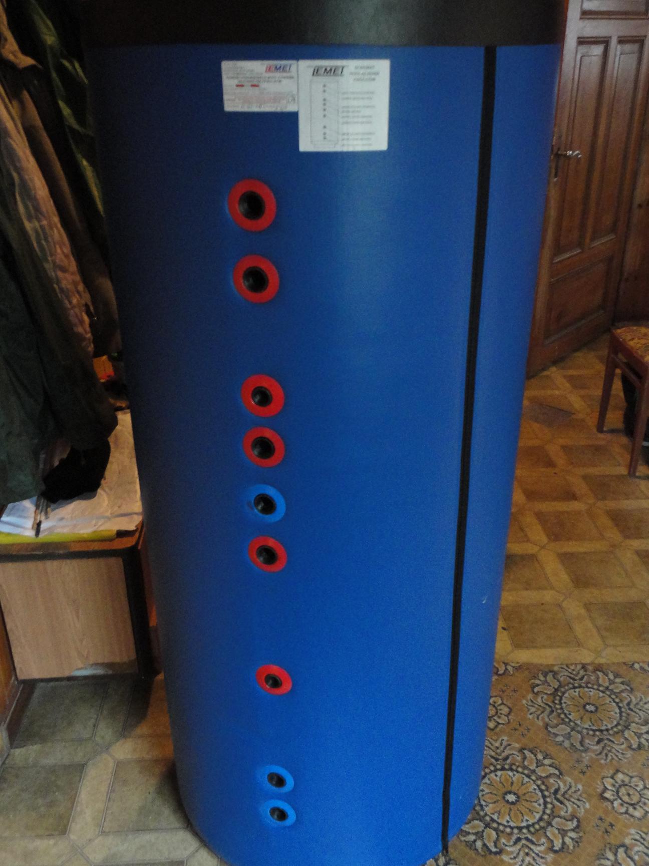 Na chwilę obecną jest dwuwężownicowy zbiornik 300l (nowy kosztował mnie 1000zł - pod Ostrołęka jest firma co takowe robi). Górna podpięta do c.o. dolna pod 2 kolektory w sumie 1800x1200x2=4,32m2 czyli 4kW odbiornik ciepła. Woda dochodzi do 70 st.C.