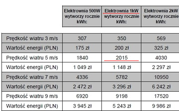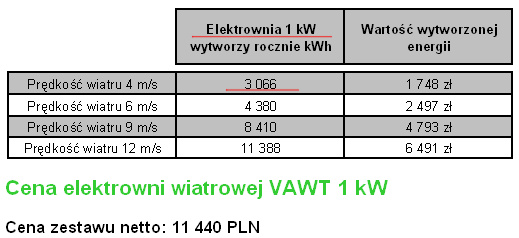 W/g sprzedawcy elektrownia o mocy 1kW przy wietrze 4m/s wyprodukuje rocznie 3066KW energii o wartości 1748 zł