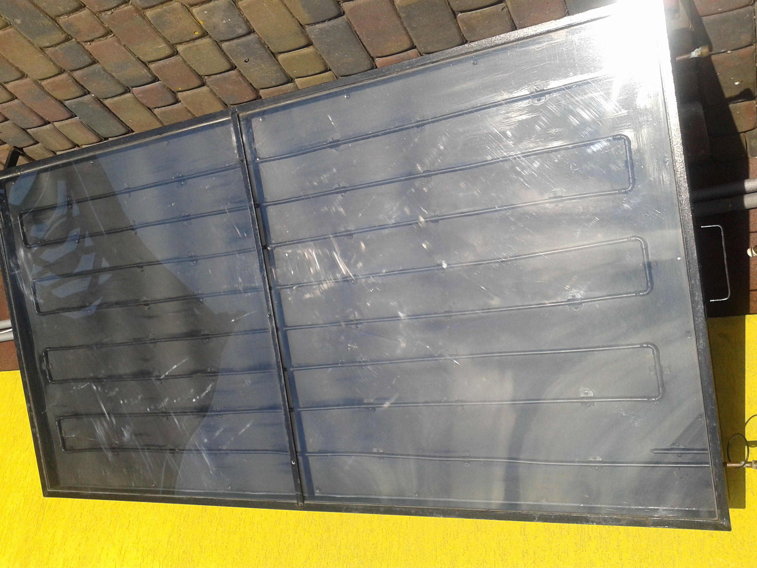 Mam do sprzedania kolektor słoneczny płaski, własnej konstrukcji, sprawny, w bardzo dobrym stanie, przystosowany do współpracy z wymiennikiem ciepła o pojemności 120 litrów. Kolektor zbudowany jest z drewnianej skrzyni o wymiarach 2,0 metra x 1,0 metra. Tylna ściana wykonana jest z blachy ocynk. Wewnątrz ocieplony wełną mineralną grubości 10 centymetrów. Absorber stanowi jednolita blacha aluminiowa stosowana do opierzeń, fabrycznie pokryta czarną matową farbą odporną na działanie promieni UV. Do blachy przymocowanych jest 8 szt rurek miedzianych o przekroju 10mm, szczelnie zlutowanych. Rurki pomalowane są czarną matową farbą. Front pokryty jest szybą typu pleksi grubości 3 mm, odporną na działanie promieni UV (dlatego tego rodzaju pleksi nigdy nie matowieje) osadzona jest w metalowej ramce, którą bez problemu można zdejmować. Kolektor posiada dwa przyłącza 1/2 cala oraz wejście do czujnika termometru. Może stać na ziemi jak również może być zamontowany na dachu. Waga około 40 kilogramów. Kolektor pracował jeden sezon i świetnie zdał egzamin. Sprzedaję bo w tym roku zainwestowałem w kolektor próżniowy. Gorąco polecam. Cena 390 zł.